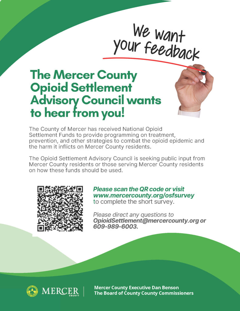 The Mercer County Opioid Settlement Advisory Council is seeking public input from Mercer County residents and those serving Mercer County residents to share ideas toward the use of opioid settlement funds that the County of Mercer is receiving from the State of New Jersey.