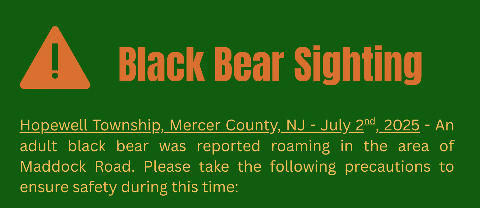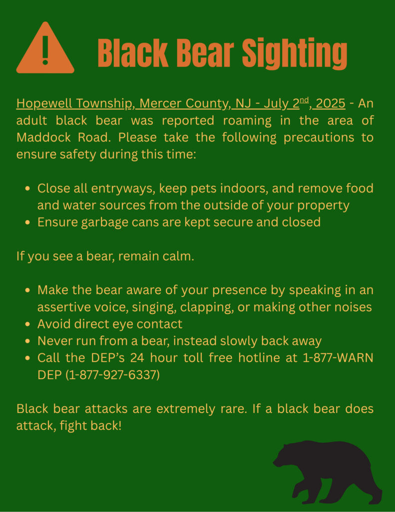 Hopewell Township officials have confirmed a report of an adult black bear roaming in the area of Maddock Road on Wed., July 2. Residents are urged to take standard safety precautions and secure their homes and properties.