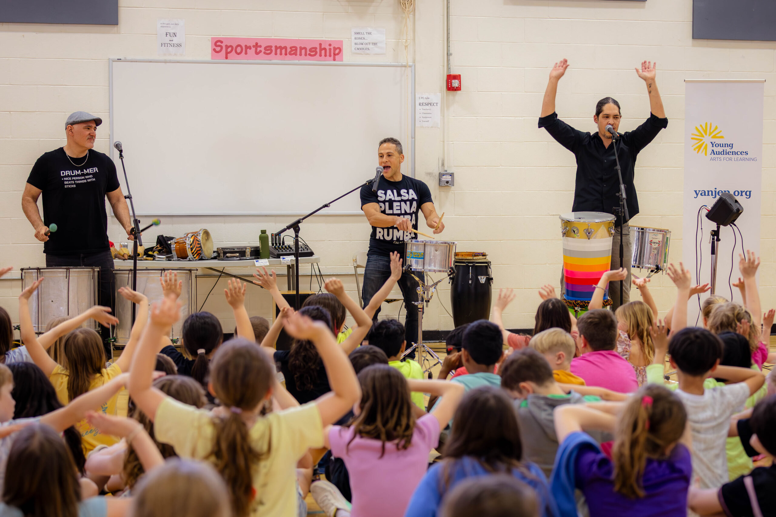 More than 200 students in grades 2 through 4 filled the gymnasium for A Journey Through Latin Percussion, an assembly by the trio Samba to Salsa, which introduced the rhythms and cultural roots of samba, salsa, and other Latin American traditions. The performance featured artists Josh Robinson, Alex Shaw, and Andres Cisneros, and included opportunities for students to engage directly with the music.