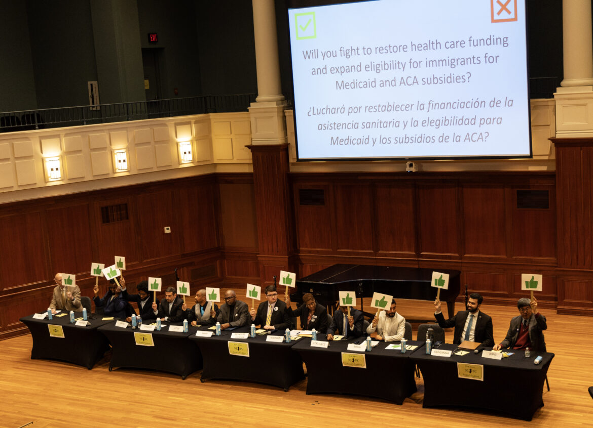 During a rapid-response segment, candidates were asked to signal their positions on a series of policy prompts using handheld paddles projected on a screen behind the stage. On questions related to expanding access to certain federal programs and restoring funding reductions, many candidates indicated support, while several used remarks in other sections to clarify how such policies should be implemented or funded.