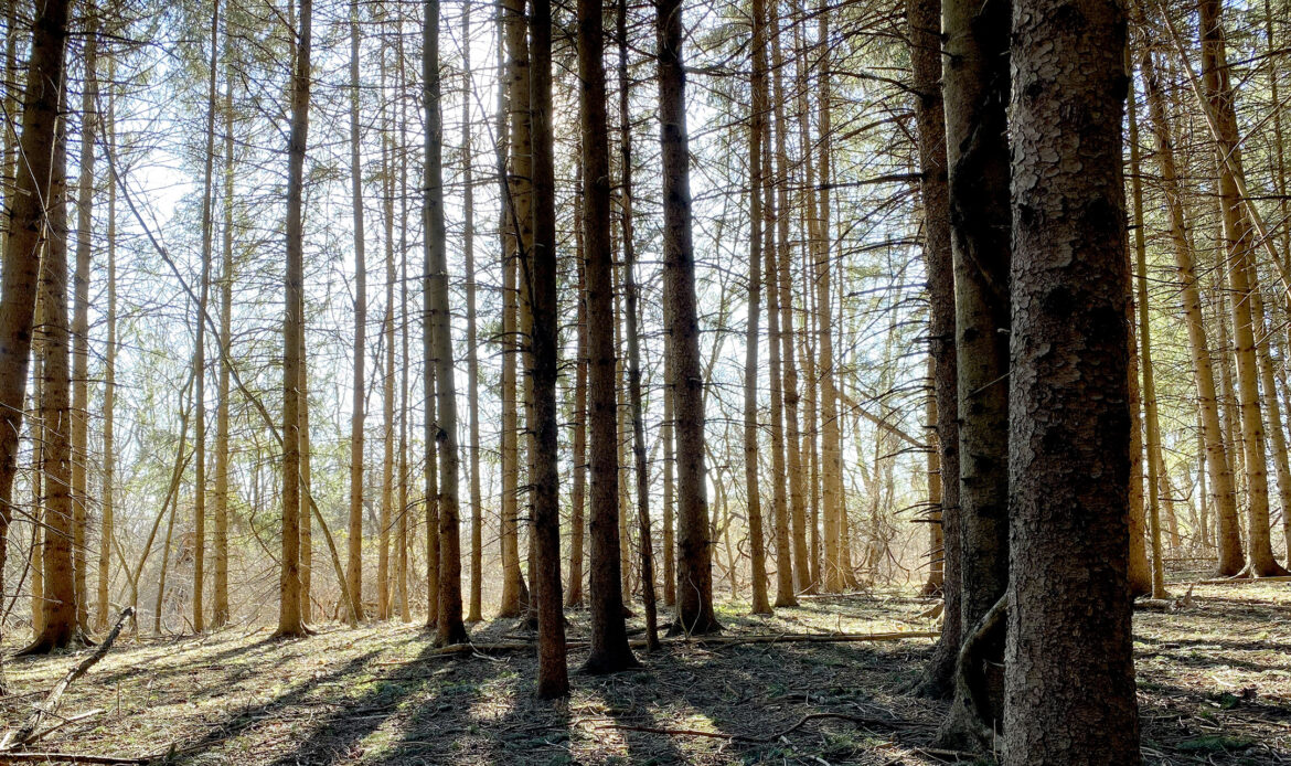 The trail then crosses a charming tributary of Woolsey Brook—a stream so quaint it feels like it belongs in a children’s book—and winds into the park’s largest spruce grove. Planted in neat rows, these trees create a tranquil space reminiscent of conservation plantings from another era, with a soft carpet of fallen needles underfoot.