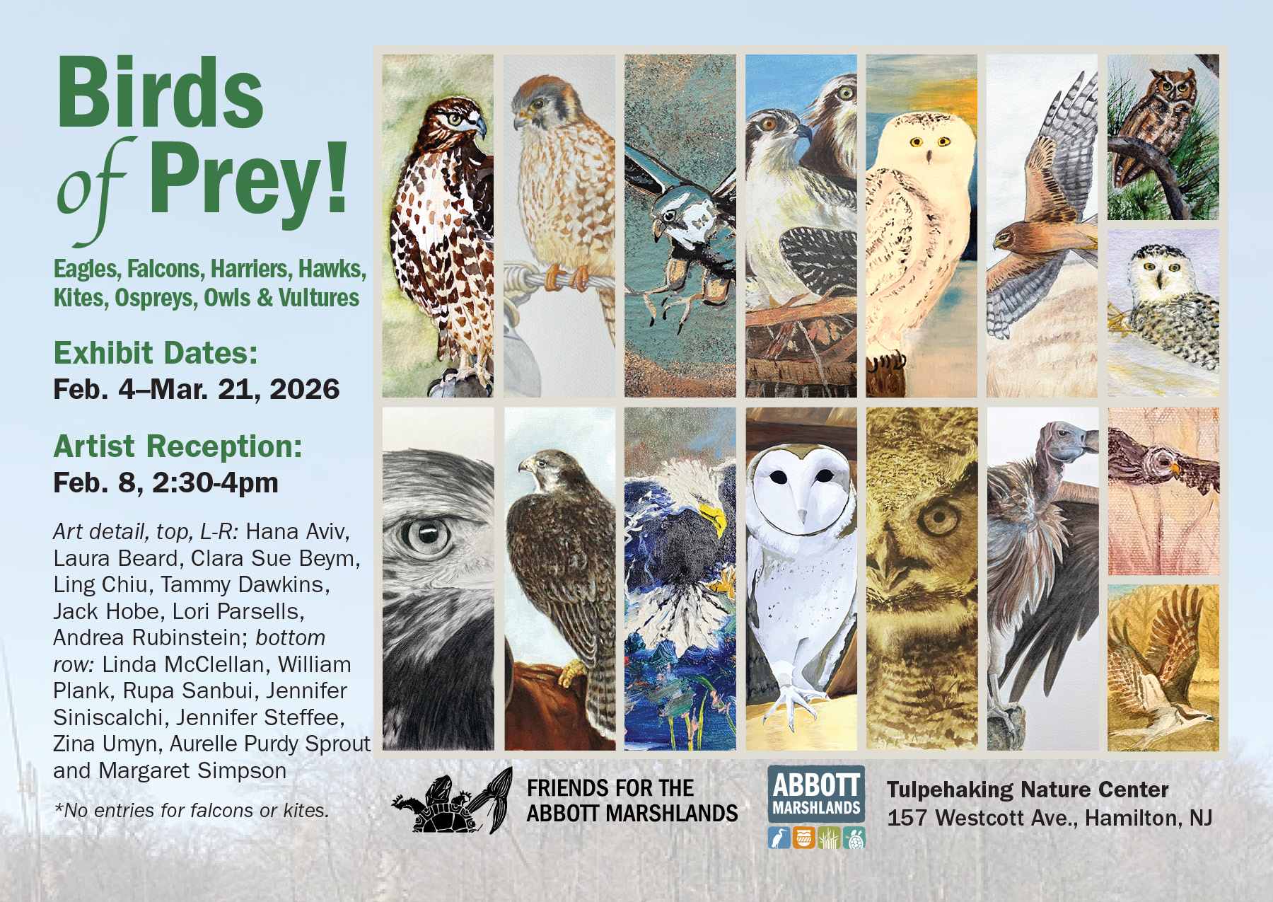 Please register to attend the Artist’s Reception at https://abbottmarshlands.org/event/birds-of-prey/