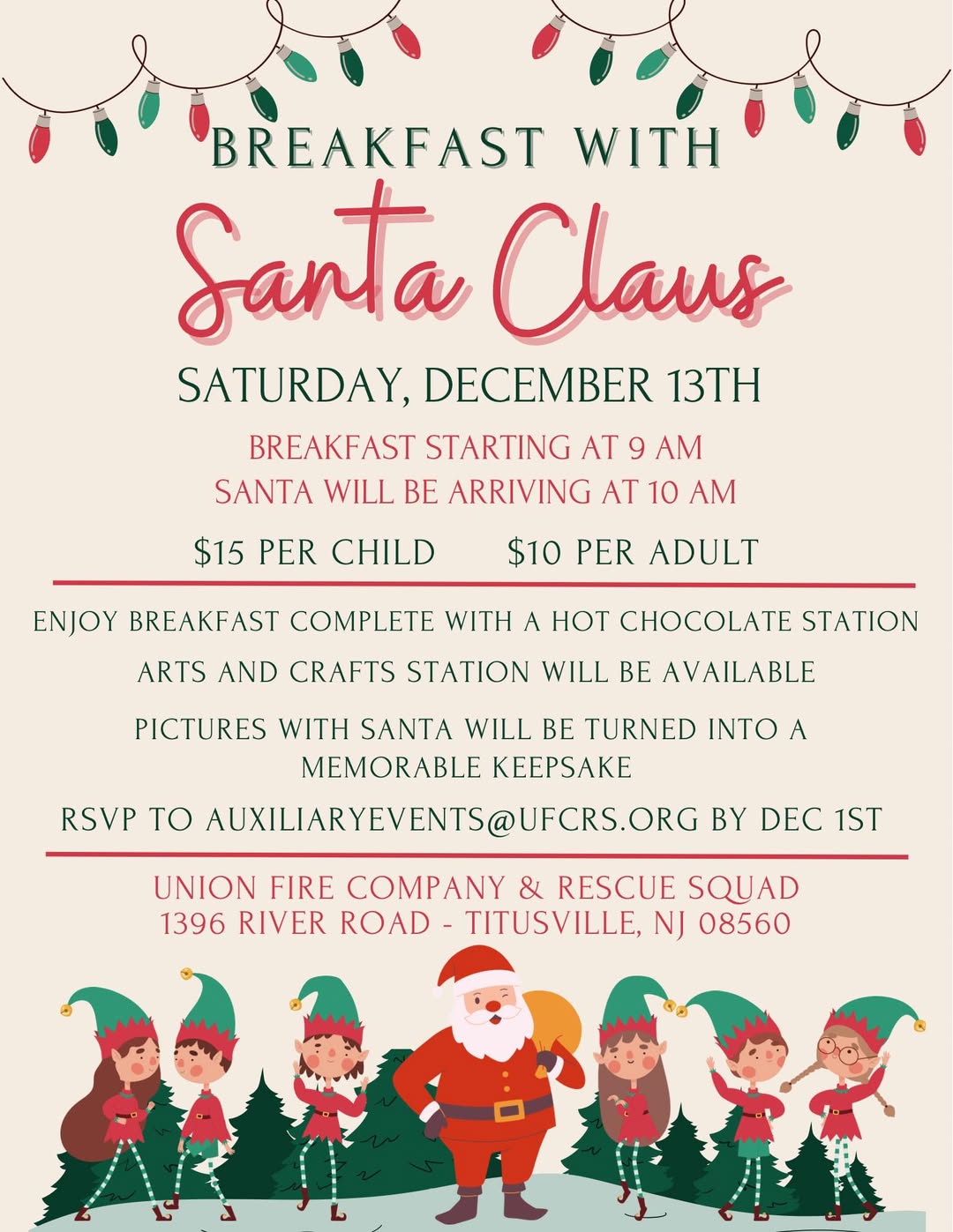 Union Fire Company & Rescue Squad will host its annual Breakfast with Santa, featuring a hot chocolate station, arts and crafts, and keepsake photos with Santa. Families are invited to…