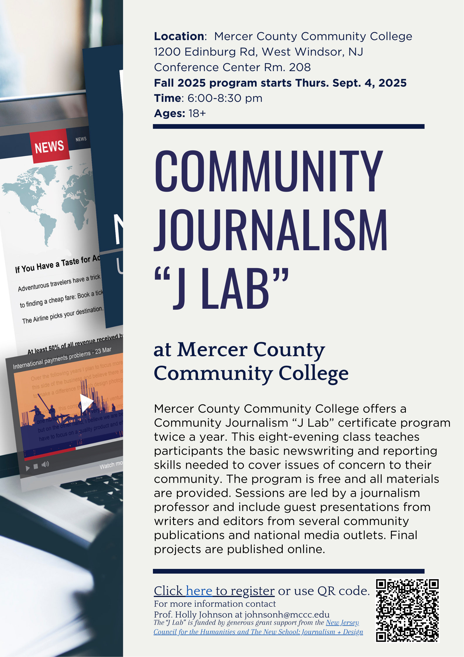 The “J Lab” at MCCC is a continuing education program for residents in the Mercer County, NJ area to learn basic skills of journalism so they can tell the stories of…