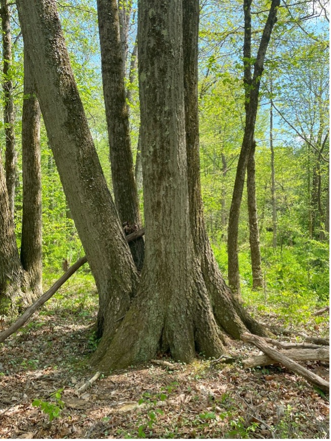 We pass a tree covered in neat rows of sapsucker holes and pause at a massive coppiced red oak. From its broad base grow four tree-sized trunks—a testament to oak’s resilience and the forest’s history of timbering. I take a moment to admire its stubborn beauty.