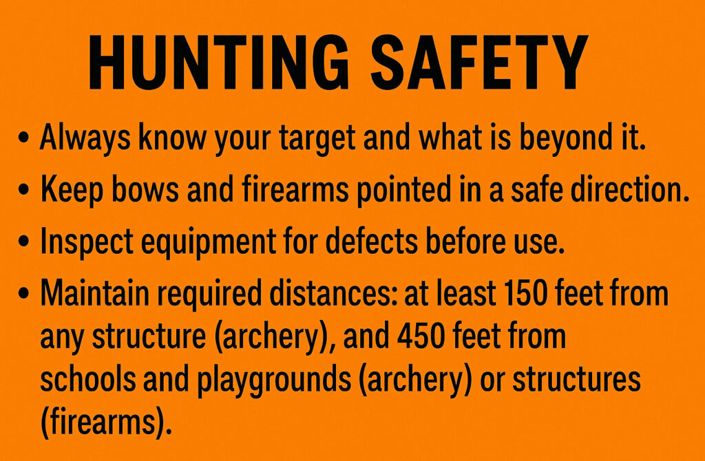 - Maintain required distances: at least 150 feet from structures (archery), and 450 feet from schools, playgrounds, or structures (firearms).