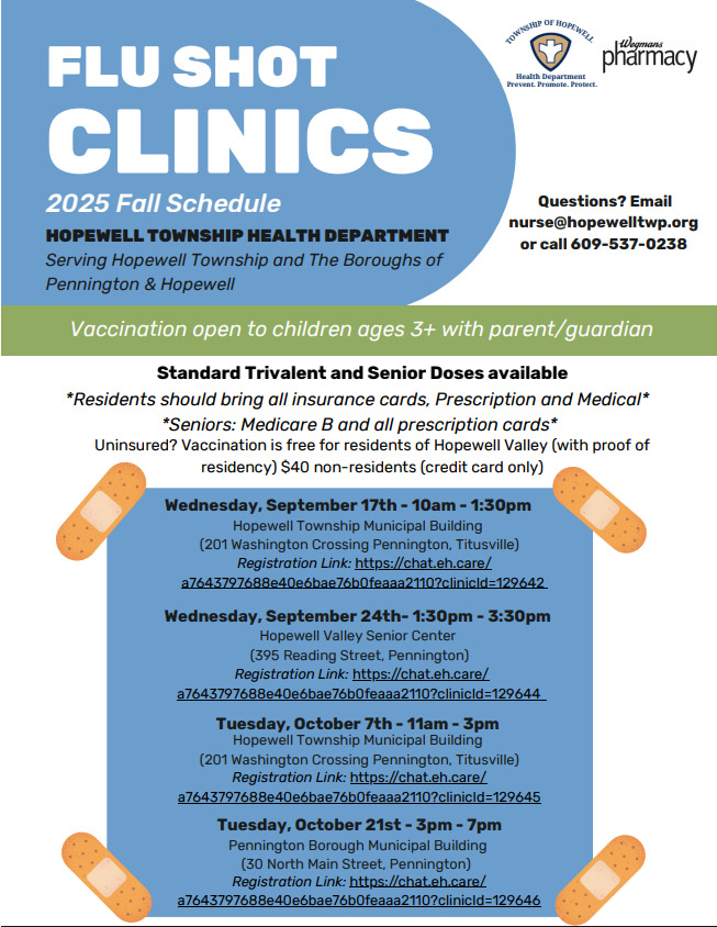 There is a Flu Shot Clinic on Tuesday, Oct 21 from 3pm-7pm at the Pennington Borough Municipal Building. This clinic is geared for residents in Hopewell Township, Pennington Borough, and Hopewell Borough.