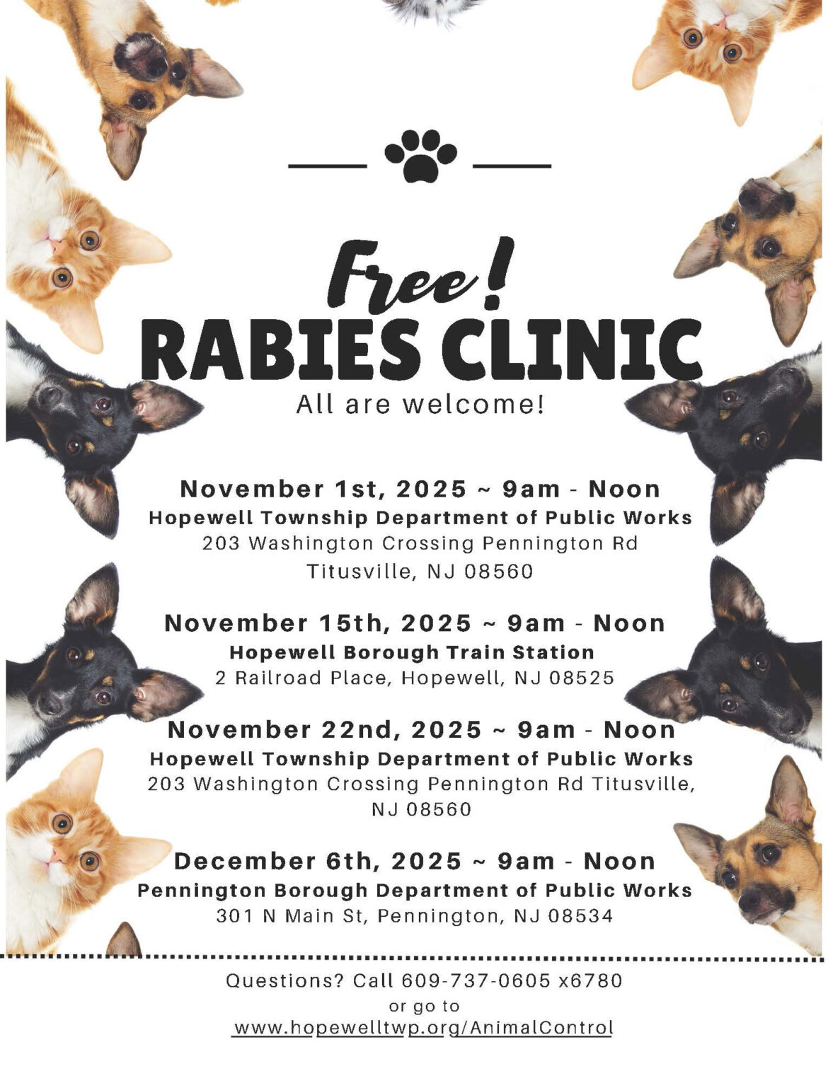 Hopewell Valley residents can take advantage of several upcoming free rabies vaccination clinics for cats and dogs this fall, hosted by local public works departments and animal control officials.