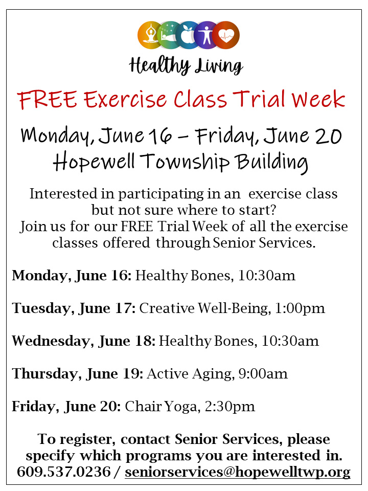 Hopewell Township Senior Services is inviting residents to try a full week of free exercise classes from Monday, June 16 through Friday, June 20 at the Hopewell Township Building. The program offers a great opportunity for older adults to explore different wellness options before committing to a class.