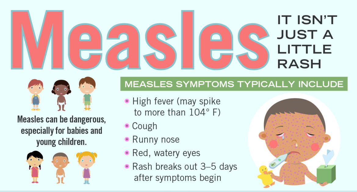Measles symptoms include high fever, cough, runny nose, watery red eyes and a rash that typically begins on the face and spreads downward. Complications can include pneumonia, encephalitis and pregnancy-related risks such as miscarriage or premature birth.