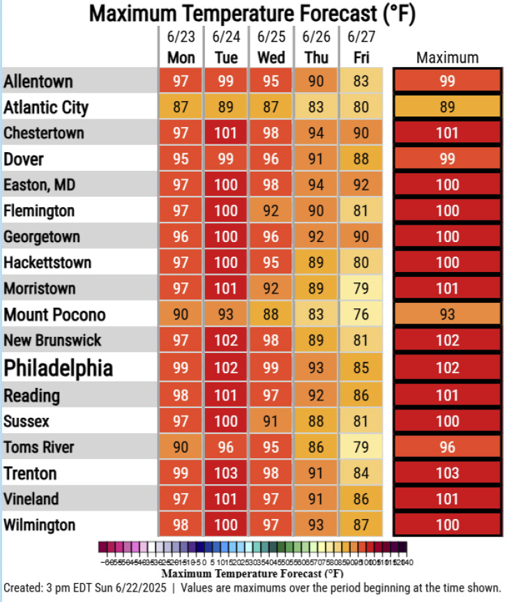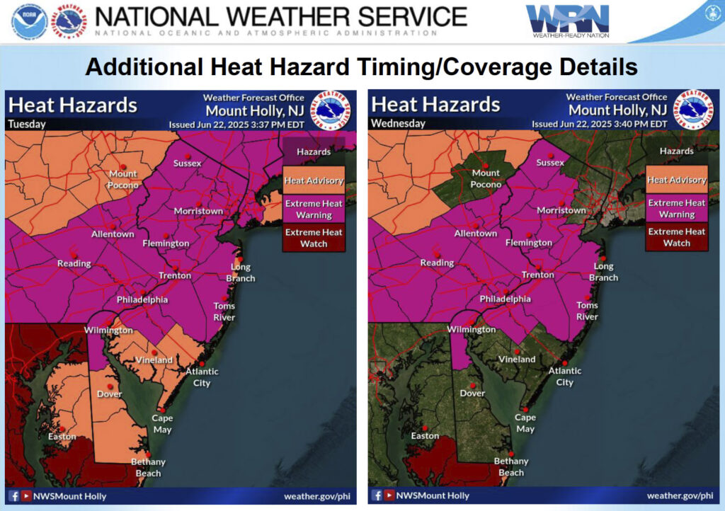“This is a prolonged heat wave with an extreme risk of heat-related illnesses,” the NWS office in Mount Holly said in a briefing issued Sunday. “Multiple consecutive days of extreme heat and humidity will likely exacerbate the impacts.”