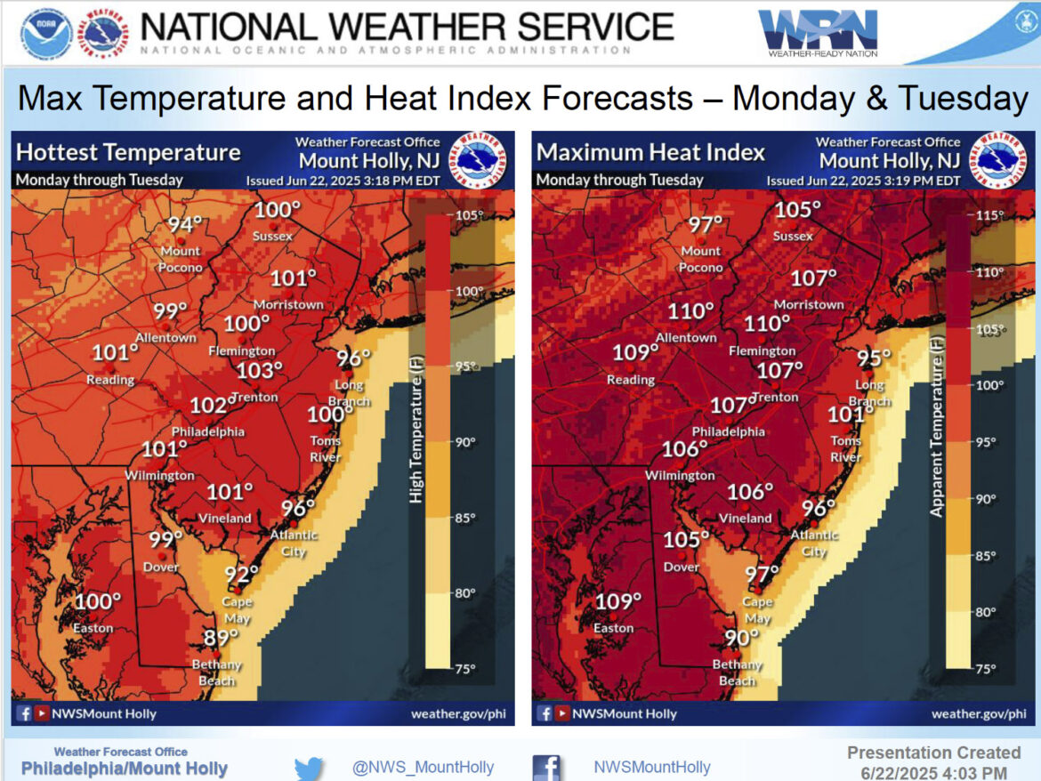 New Jersey is bracing for several more days of dangerous heat, with temperatures expected to climb into the upper 90s and heat index values reaching as high as 110 degrees in some areas. The extreme heat is forecast to continue through Wednesday, with Monday and Tuesday likely to be the hottest and most hazardous.