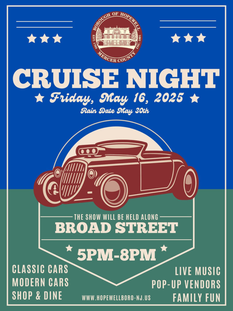 The residents, businesses and restaurants of Hopewell and the Hopewell Borough Recreation Committee invite you to join the Borough Community for cruise night, on Friday May 16, 2025 from 5:00 to 8:00 PM. Live music, games, delicious food, shopping and lots of fun will line East and West Broad Street. Come see what downtown Hopewell Borough has to offer! Be sure to check the Borough’s website and FaceBook feed, which will be updated with any weather related information. The rain date this year is May 30, if needed.