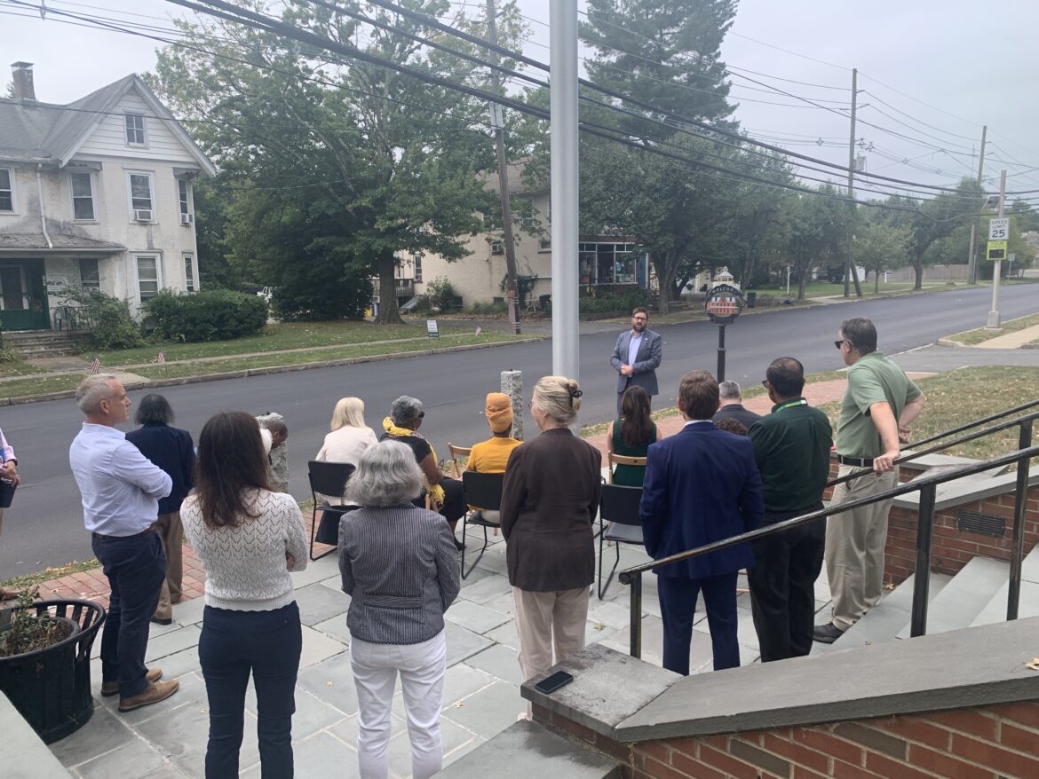 Under pleasant if mostly cloudy skies, Hopewell Borough officials and luminaries from the Township, County, and schools gathered at Borough Hall beside the flagpole for a ribbon cutting ceremony, on September 4, 2024, to celebrate recent town achievements in pedestrian and bicycle safety.