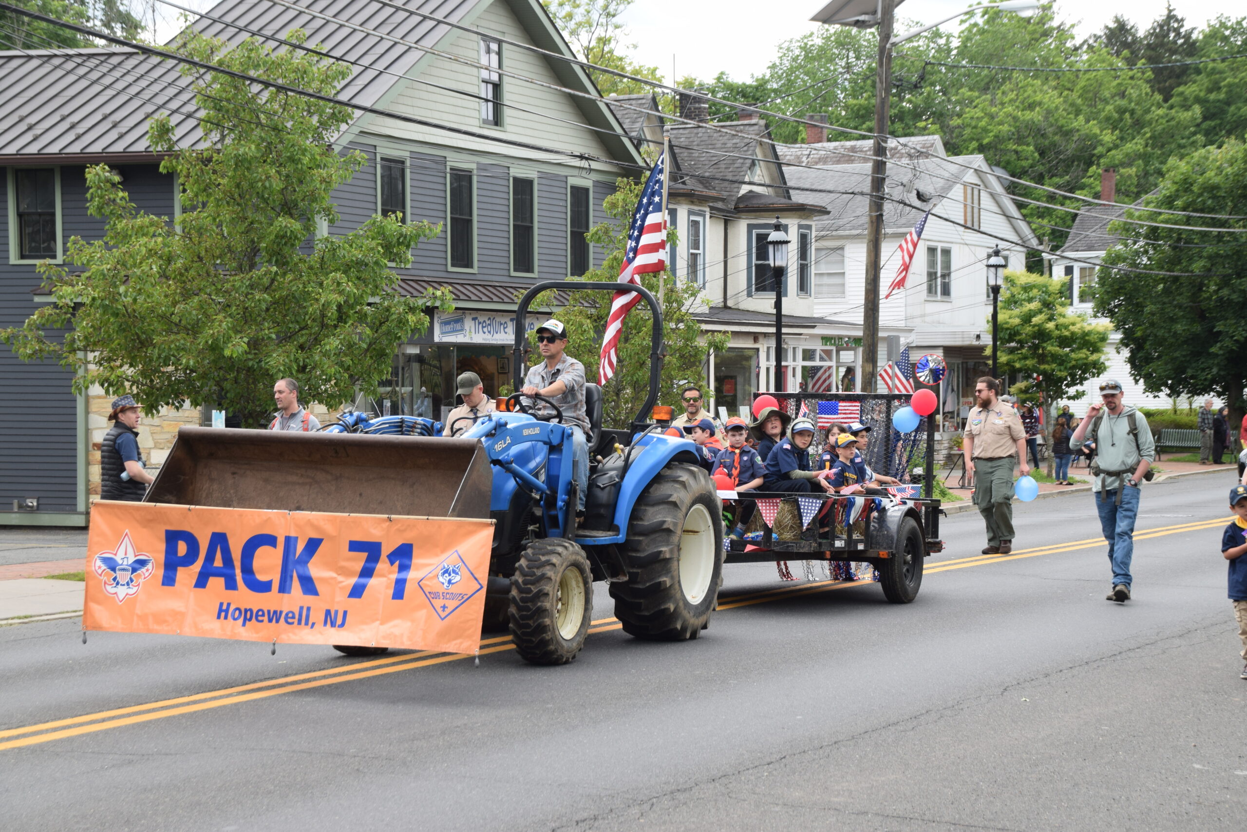 To the delight of several hundred flag-waving residents lining Broad Street, the parade continued with displays of police and military vehicles, classic and modern fire trucks, ambulances, classic cars, farm tractors, the Hopewell Valley Central High School Marching Band and Color Guard, Boy Scouts and Girl Scouts from local troops, and floats by businesses such as Old Glory Detailing, Fairground Farm, and Chubby’s Restaurant.