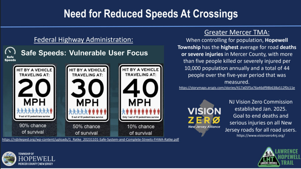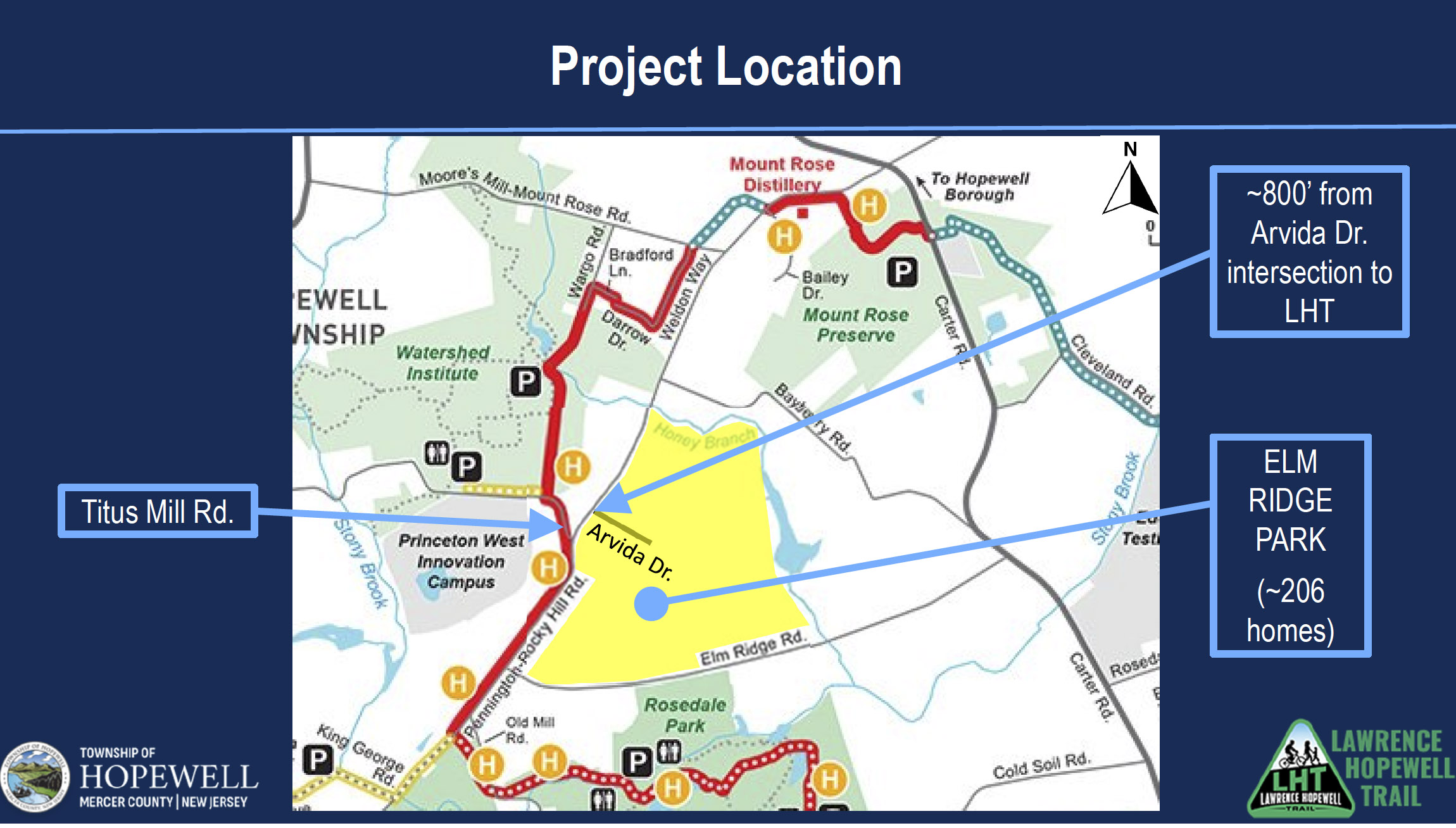 The Hopewell Township Committee meeting opened on Monday with a presentation from the Lawrence Hopewell Trail (LHT), which is seeking to improve pedestrian safety near the Elm Ridge Park neighborhood. The discussion centered on Pennington-Rocky Hill Road and Titus Mill Road, where there is increased pedestrian traffic from people crossing from the Elm Ridge neighborhoods to the LHT.