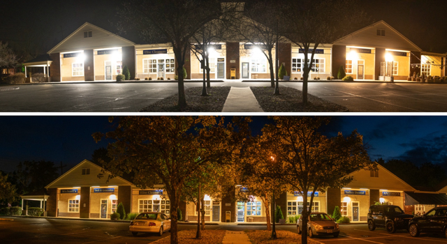 This summer, the DarkSky Hopewell team approached Steve Ebersole, owner of Hopewell Village Square, about ten wall-mounted fixtures that blasted bright white light across the property—into people’s eyes, through nearby windows, and straight up into the sky. Studies by DarkSky International show that poor orientation alone can waste up to 30 percent of outdoor light, and these fixtures were a clear example.