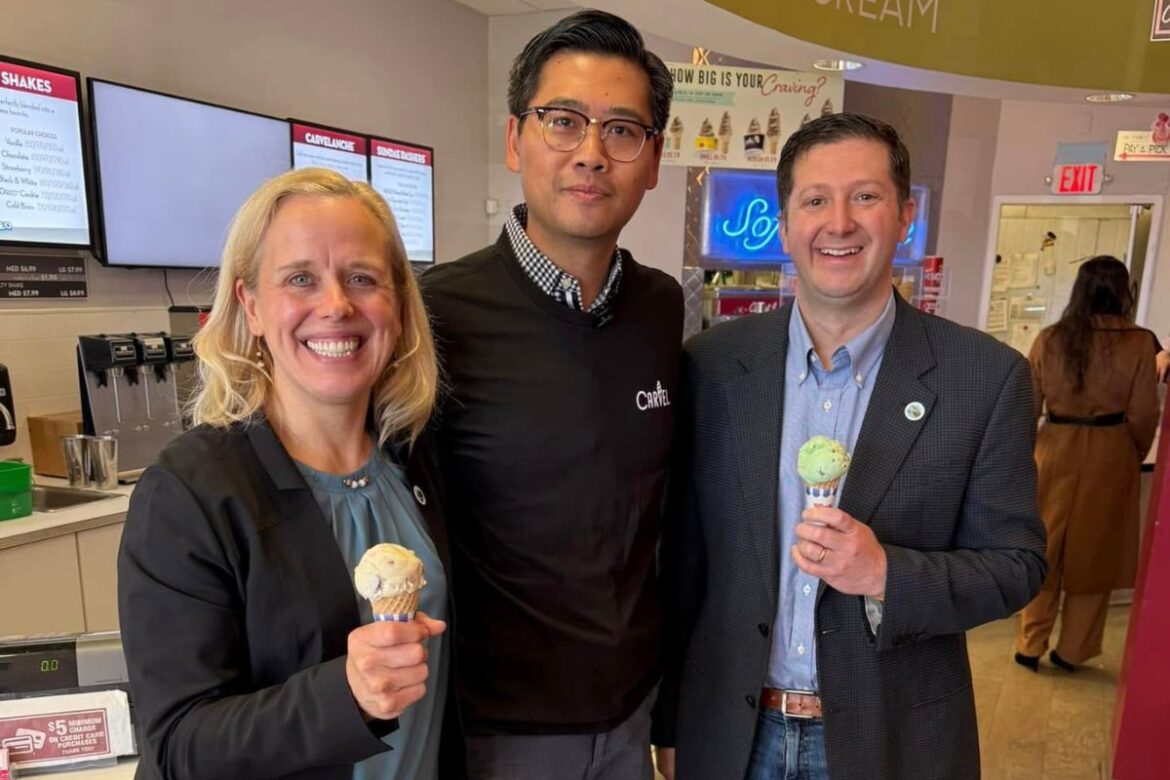 Last week, Hopewell Township Mayor Courtney Peters-Manning and Deputy Mayor Michael Chait joined Carvel owner Henry Wong to celebrate the store’s participation in PSE&G’s energy efficiency program. Wong sought to lower energy costs while improving in-store comfort—an effort that led to key upgrades in the shop’s heating and cooling systems.