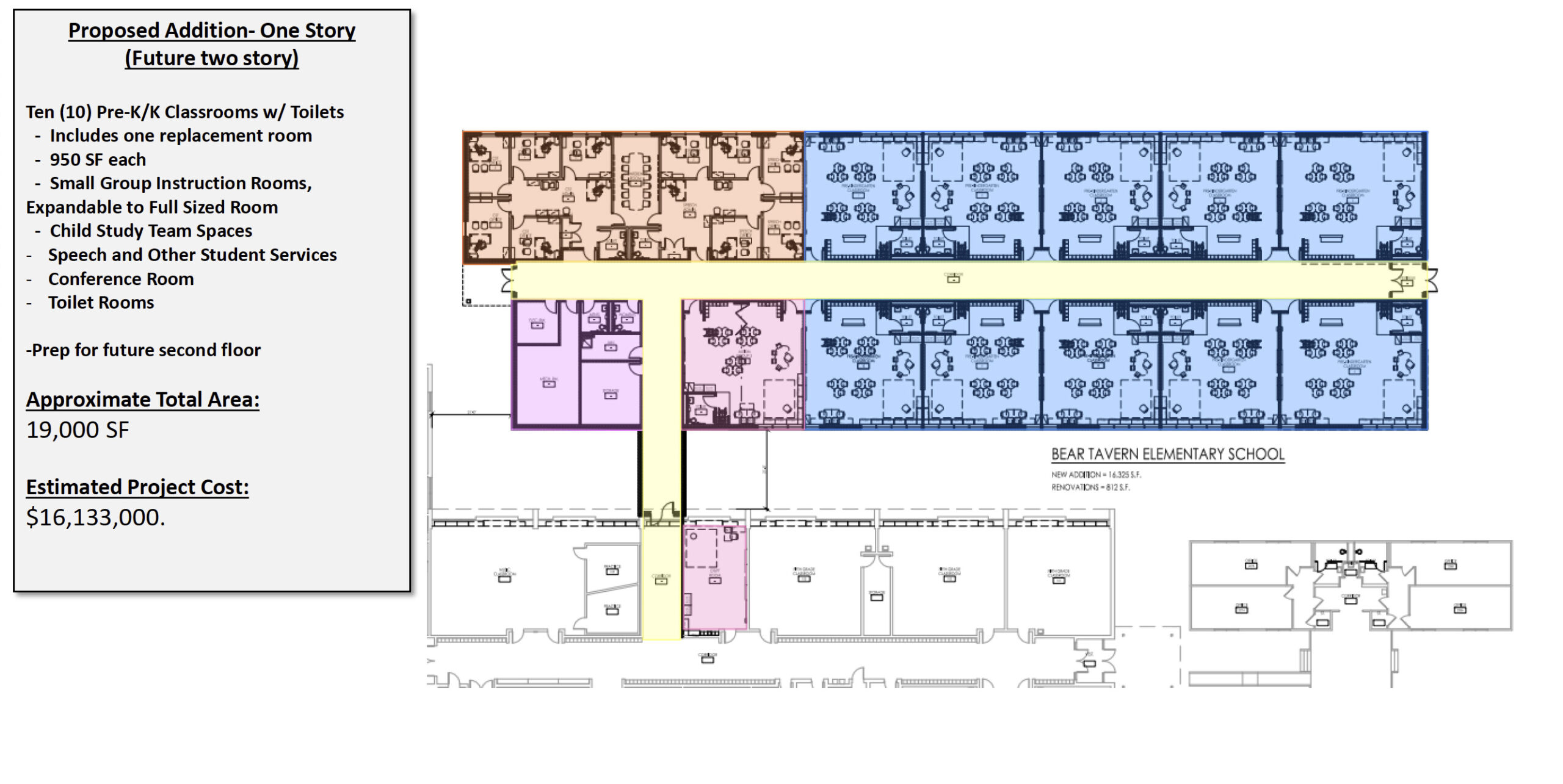 The proposed project would add ten pre-K and kindergarten classrooms with restrooms, including one replacement room, and dedicated space for small-group instruction and student services like speech and Child Study Team support. The one-story, 19,000-square-foot addition is being designed with infrastructure for a future second floor. The estimated project cost is $16.1 million.