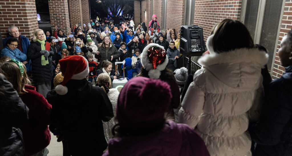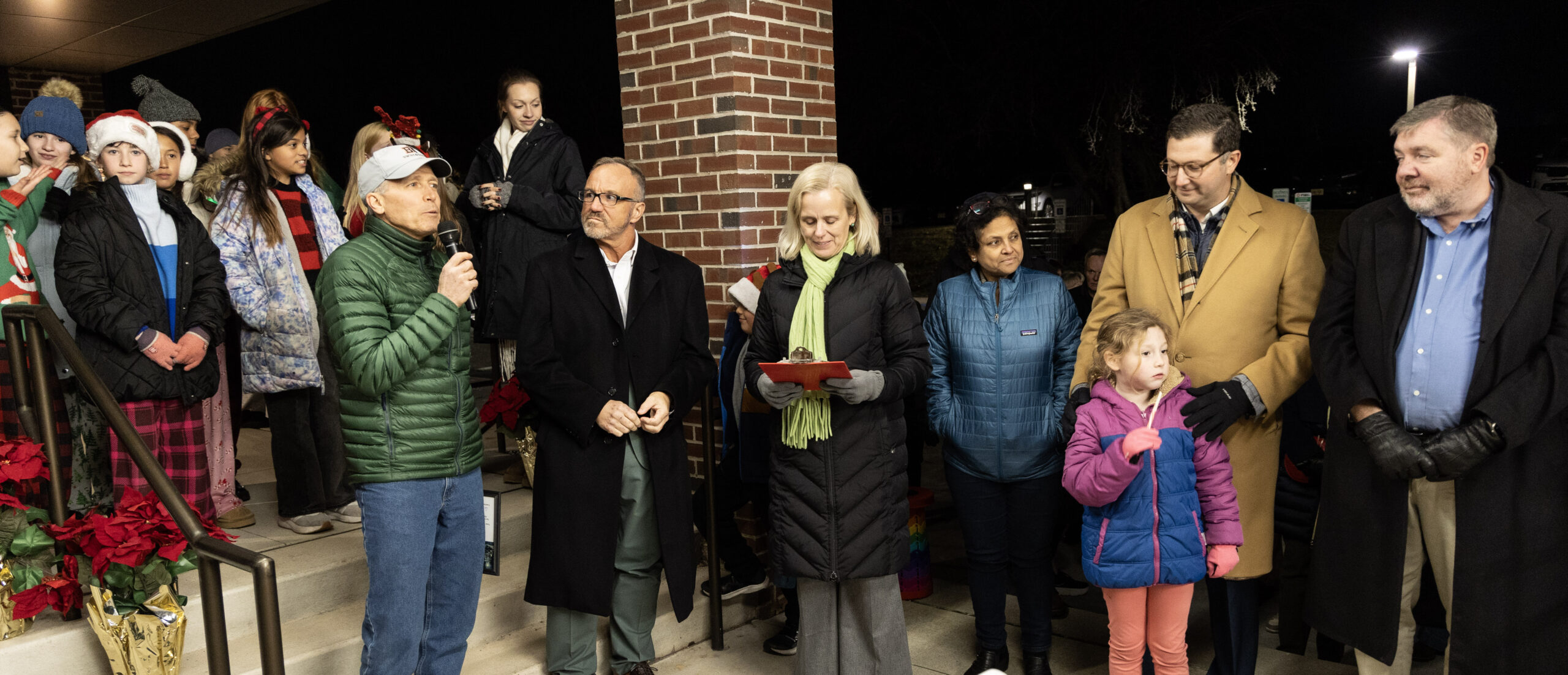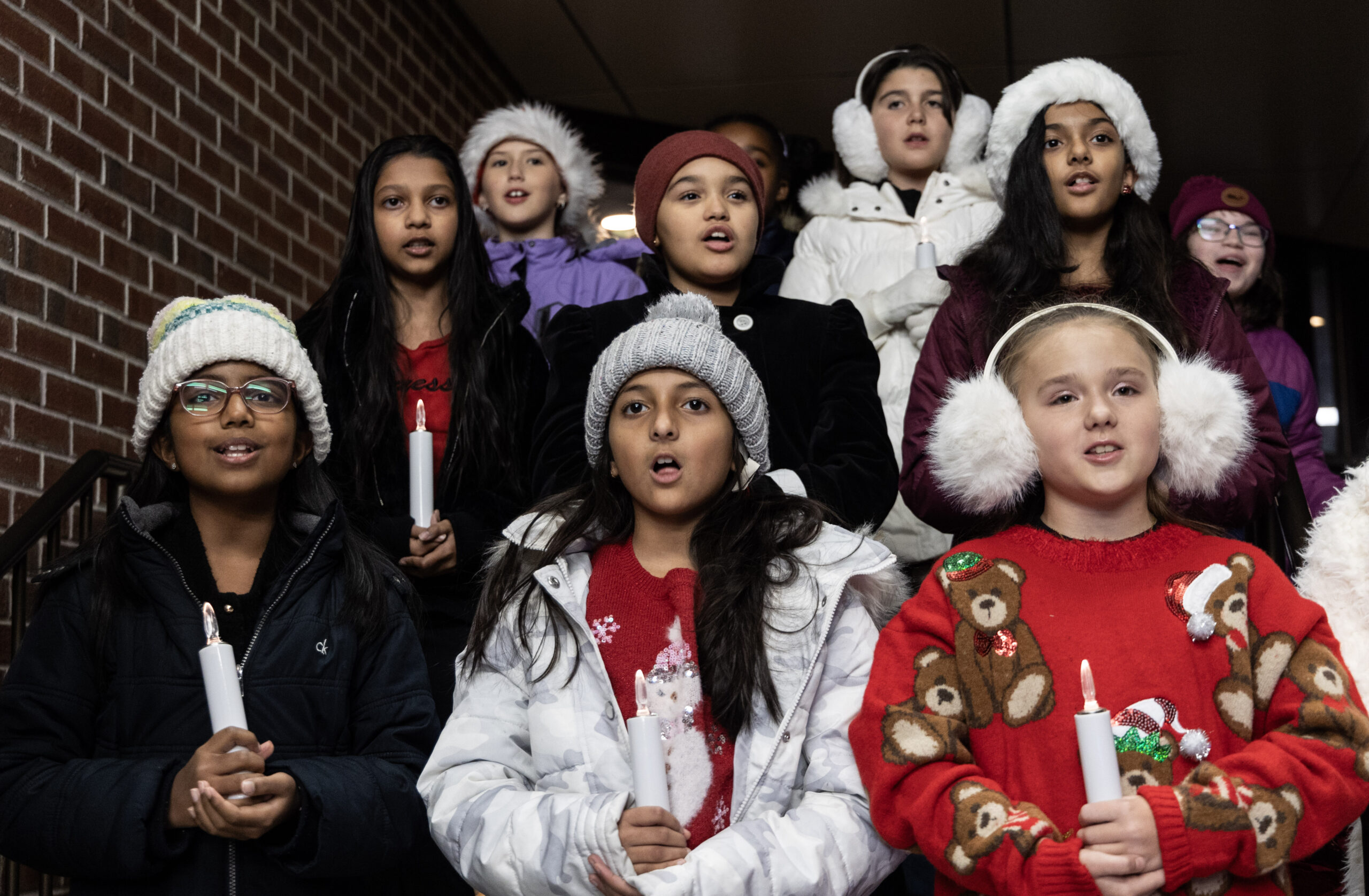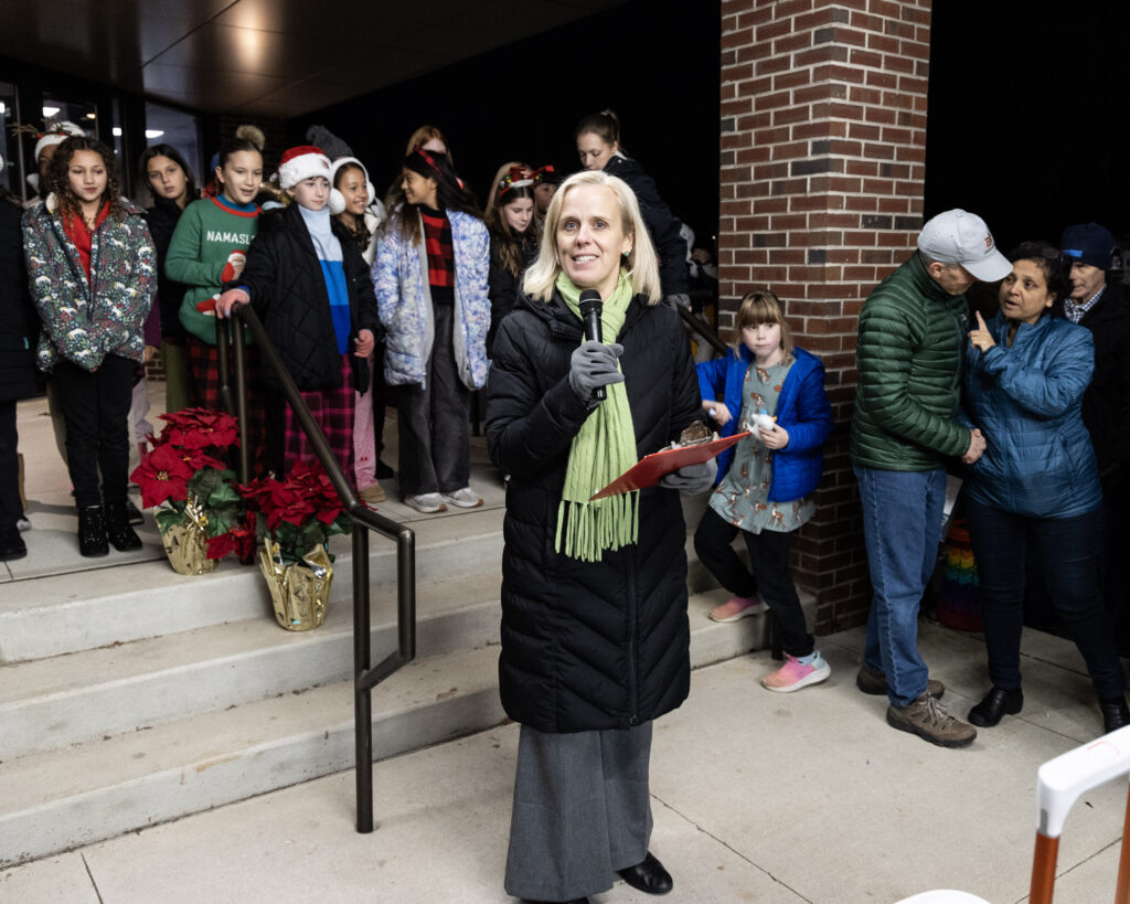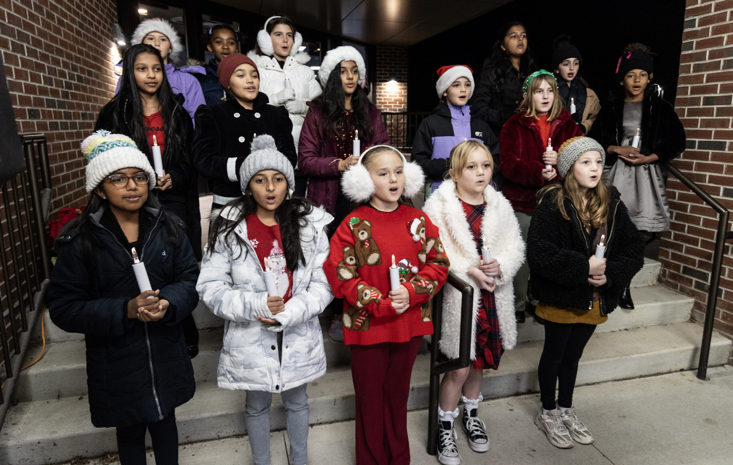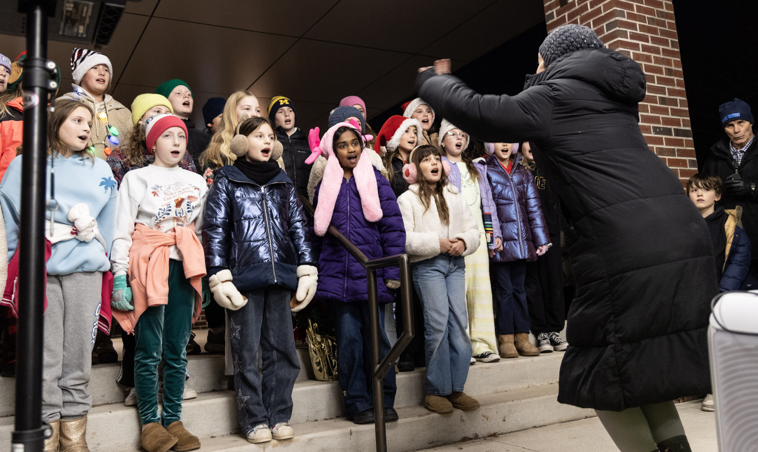Mayor Courtney Peters-Manning welcomed residents as children in brightly colored hats and earmuffs crowded onto the steps behind her, where three elementary school ensembles performed from the building’s main entrance — turning the portico into a seasonal stage.