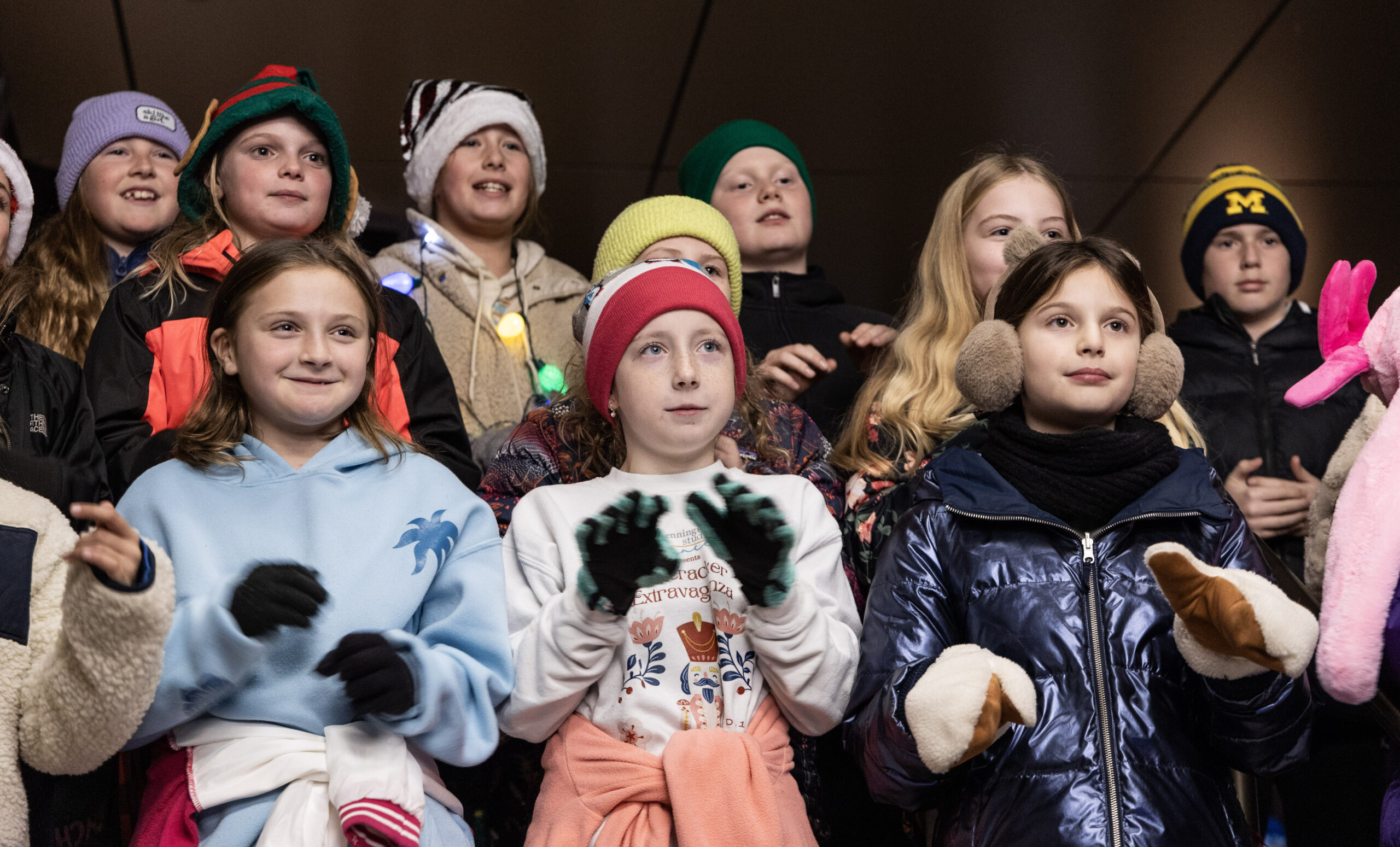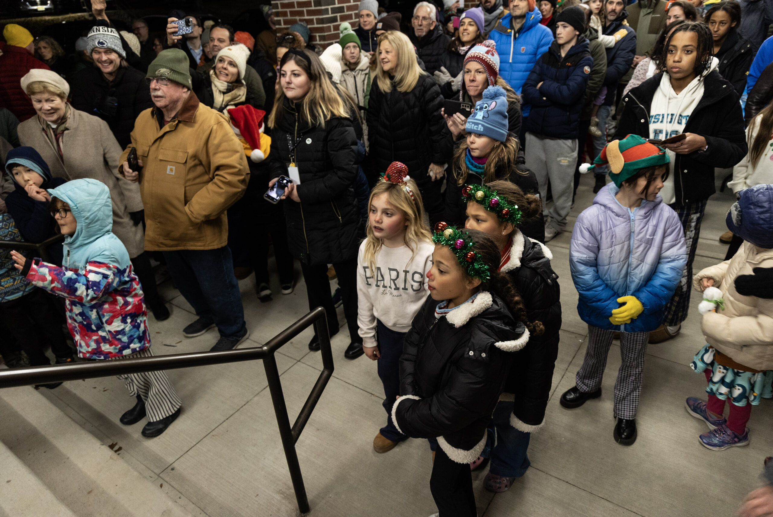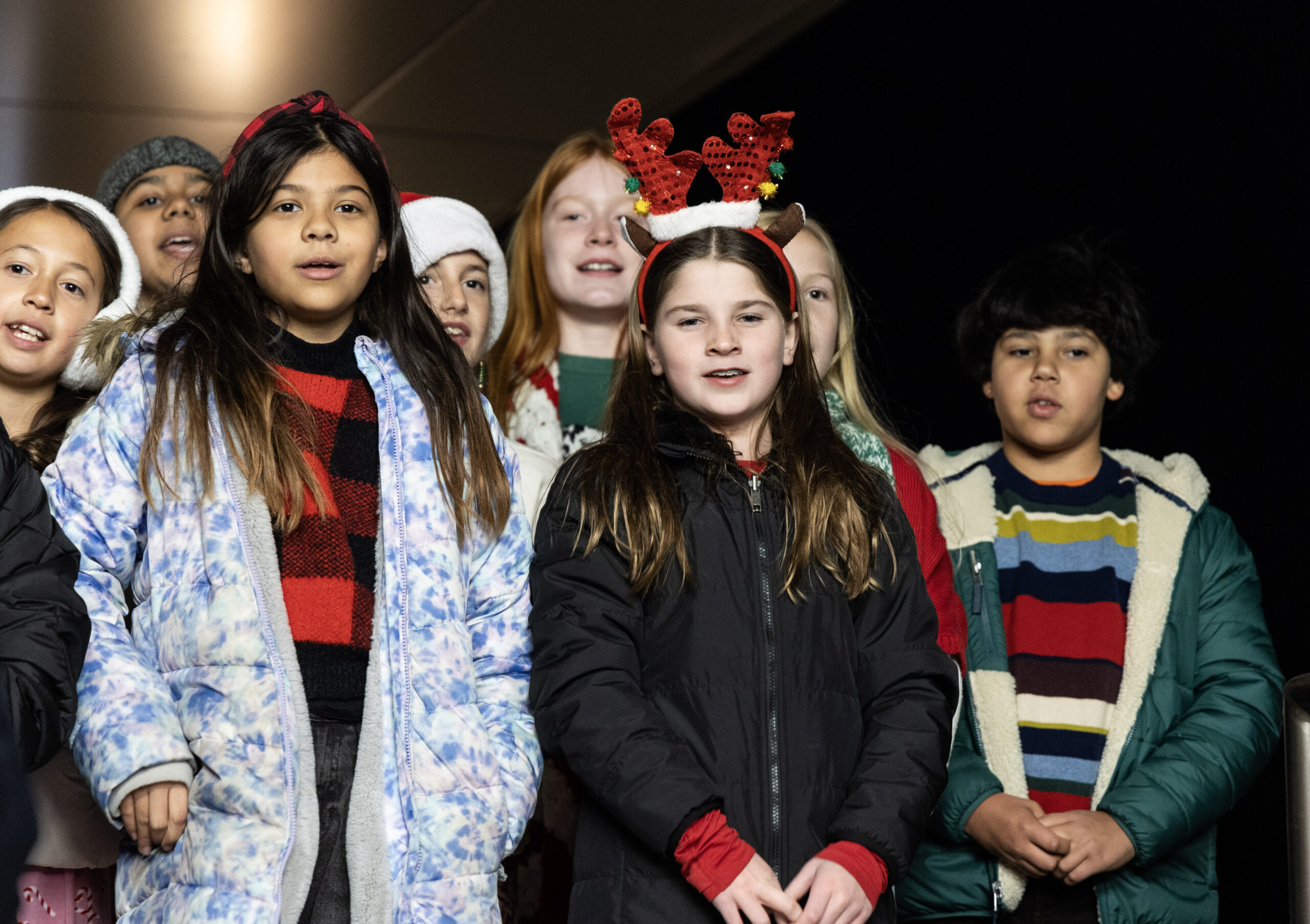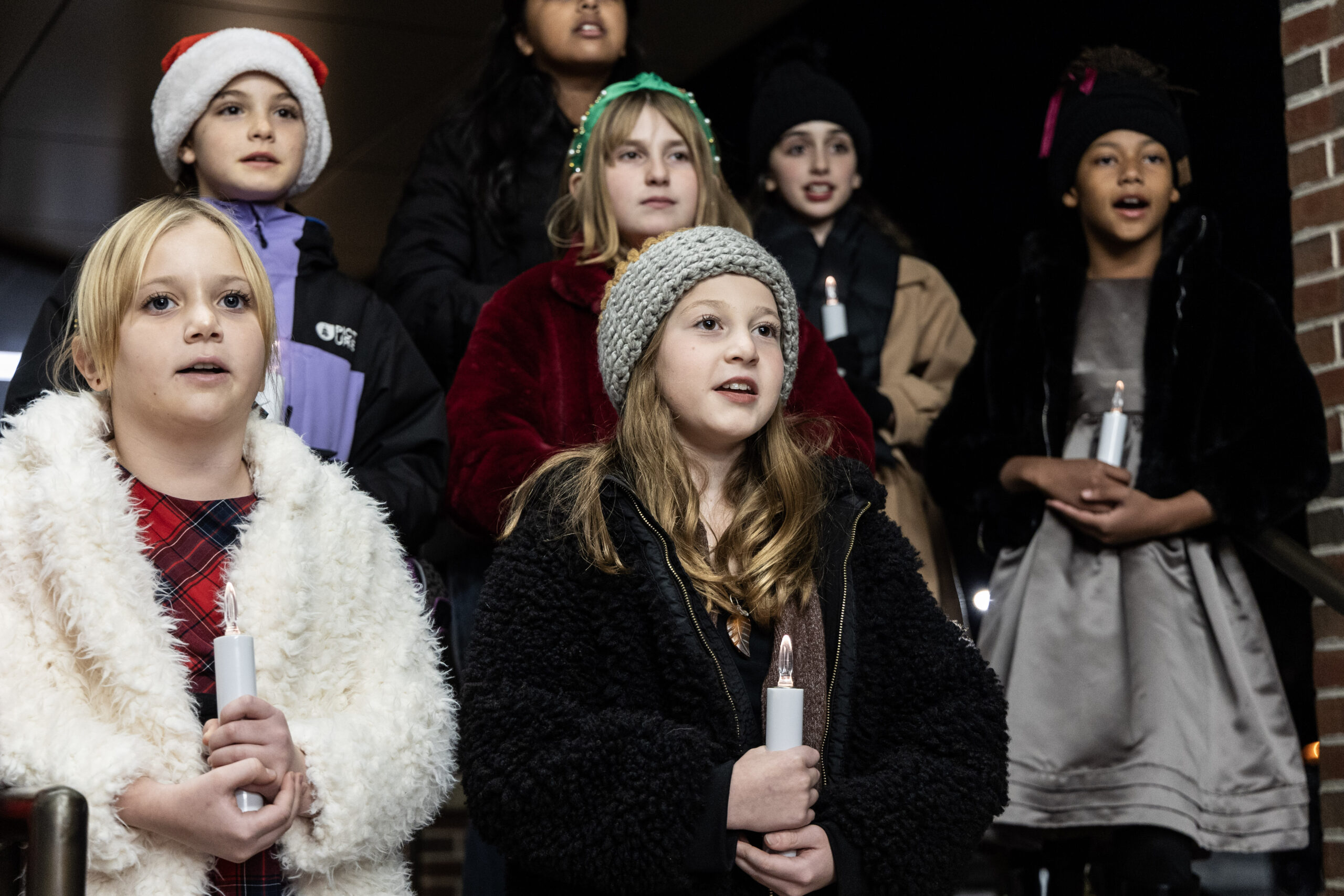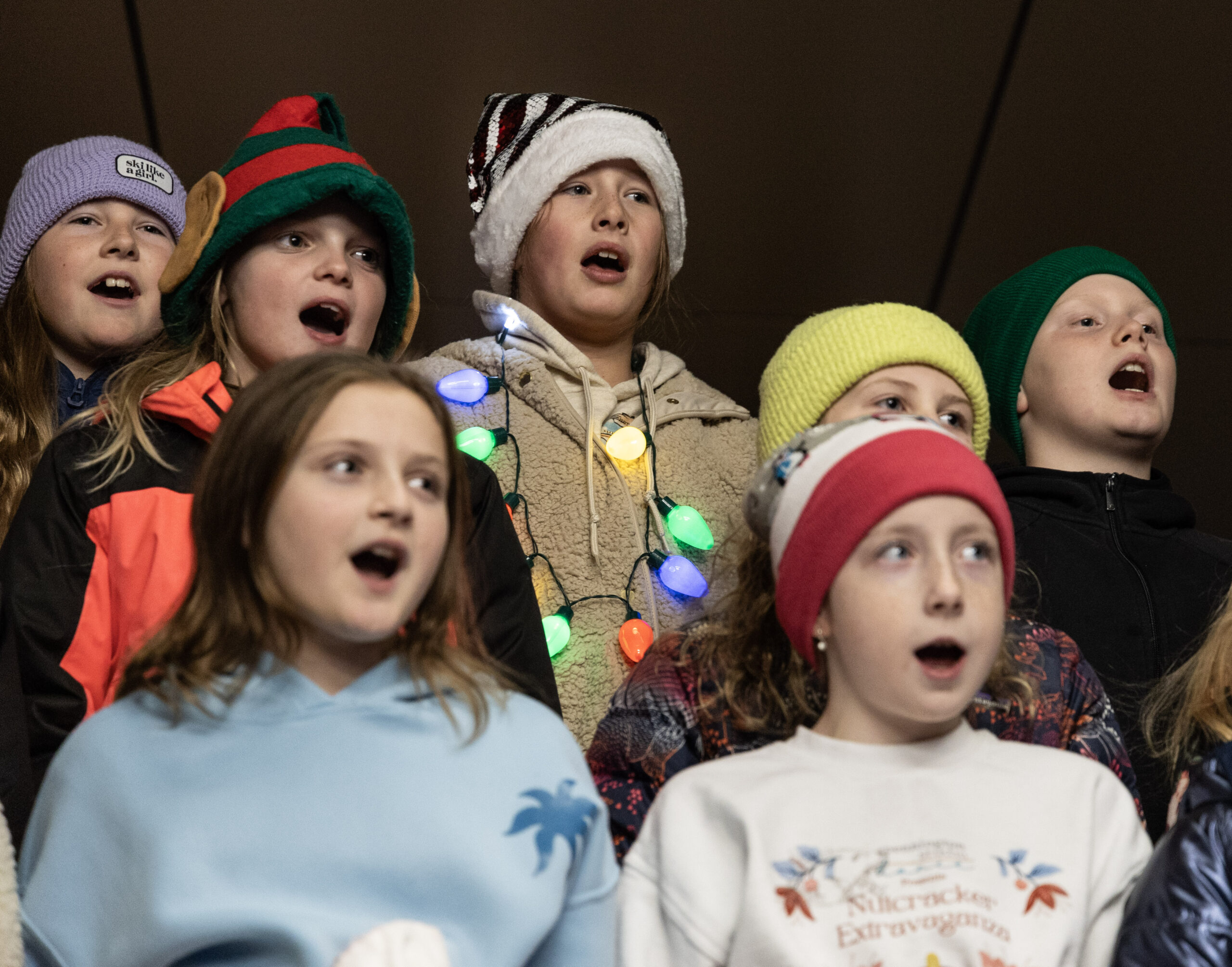 Mayor Courtney Peters-Manning welcomed residents as children in brightly colored hats and earmuffs crowded onto the steps behind her, where three elementary school ensembles performed from the building’s main entrance — turning the portico into a seasonal stage.