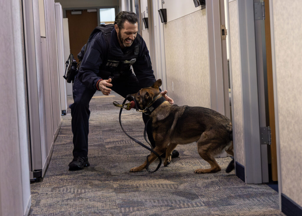 Back in the hallway, after Riley’s training find, Voorhees crouched beside her, rewarding her with a burst of praise and an enthusiastic round of tug. In these moments she seems like any family dog, before quickly settling and waiting for whatever came next.