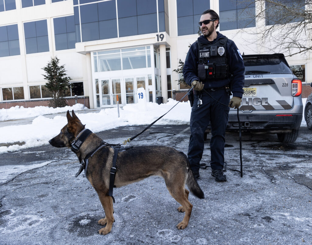On a quiet hallway inside an unused office building at the Princeton West Innovation Campus, Officer Robert Voorhees paused just long enough to let his partner, Riley, get excited about their next task. Moments earlier, they had entered the corridor with no idea where the explosive training aid had been hidden. They began working methodically, checking rooms on both sides, Voorhees keeping steady tension on the leash as Riley swept in and out of doorways.