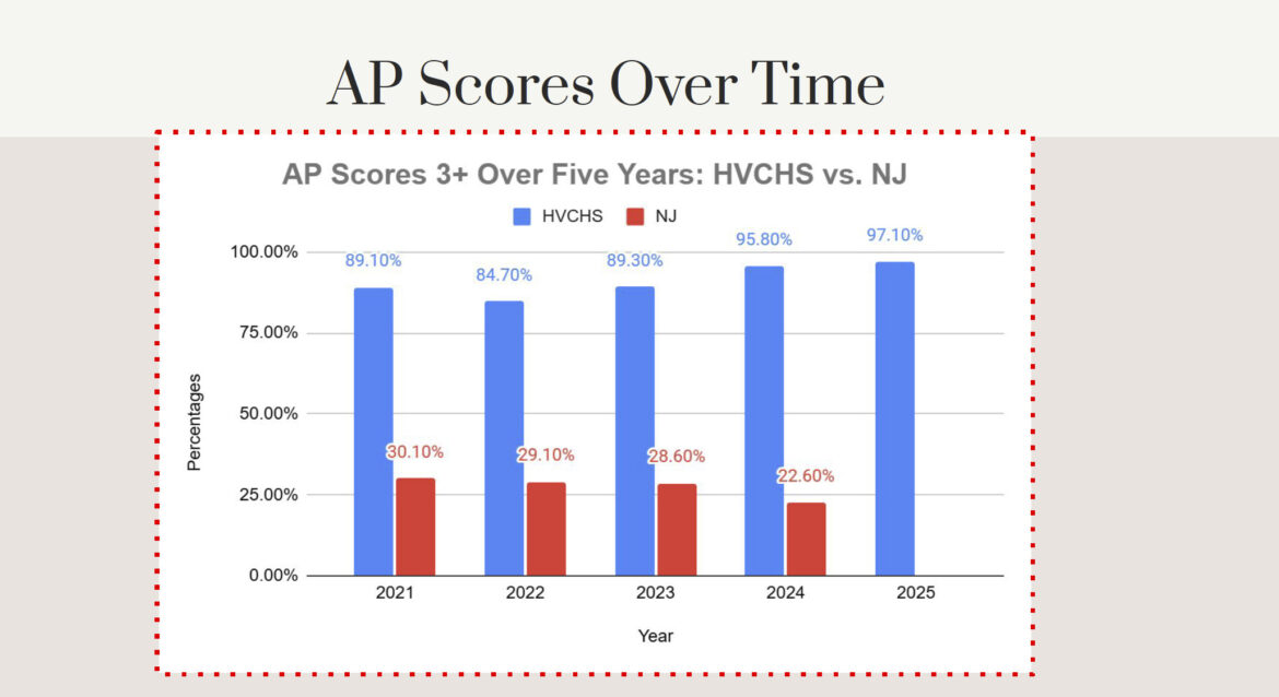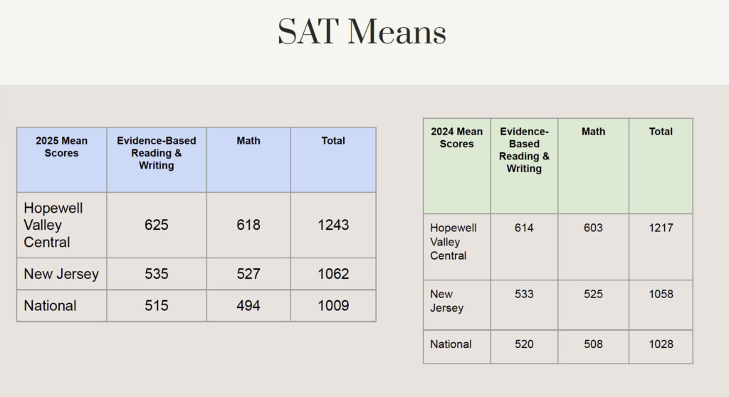Pilitsis credited strong vertical alignment and collaboration among teachers for preparing students to take on rigorous coursework.The report also showed Hopewell Valley’s mean SAT score (1243) exceeded both the state average (1062) and the national average (1009), continuing a five-year trend of steady improvement.