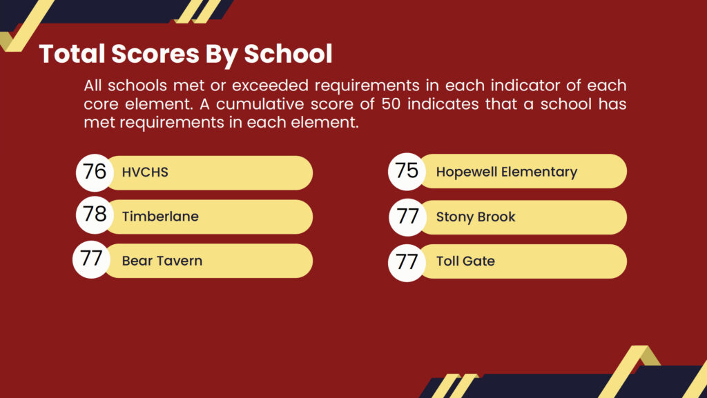 Supervisor of Counseling Corrine Rutt presented the 2024-25 Anti-Bullying Bill of Rights (ABR) self-assessment, a state-mandated review of prevention programs, training, and incident reporting. Each Hopewell Valley school again scored well above the state’s threshold of 50 points, with most buildings earning ratings that exceeded requirements in multiple categories.