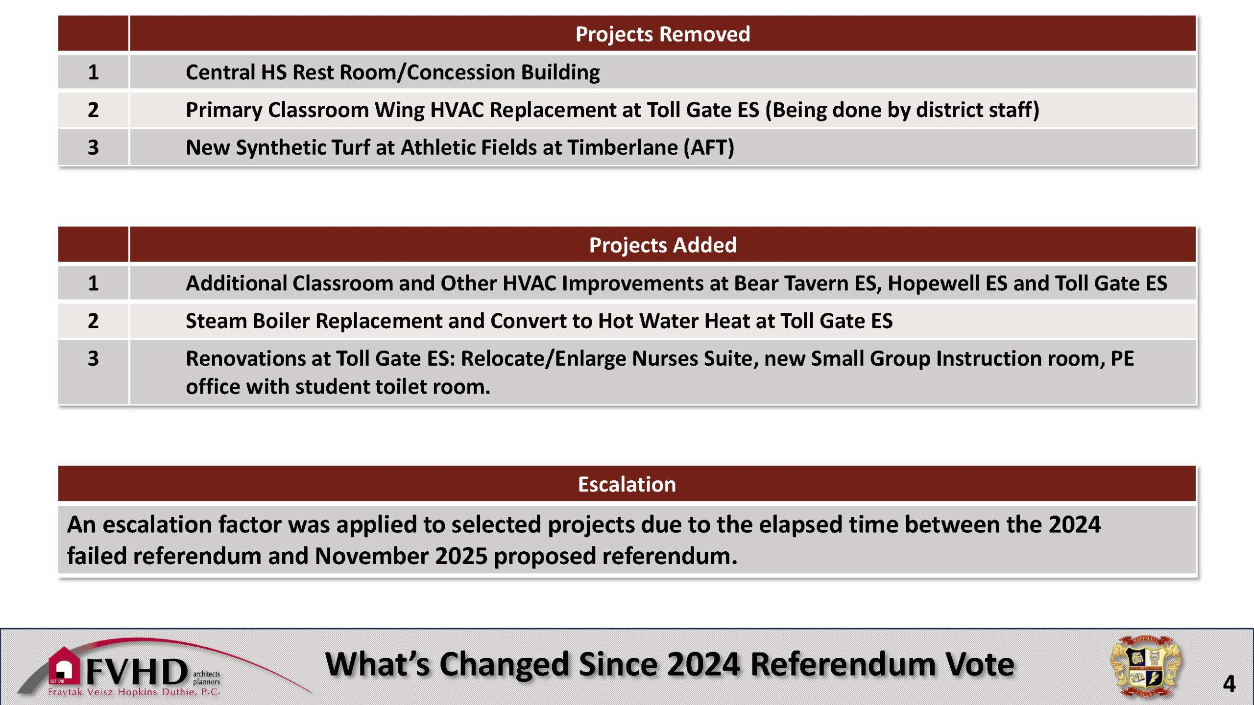 Some projects from the 2024 proposal were removed, including a synthetic turf field at Timberlane and a CHS restroom/concession building. But others were added in response to breakdowns, such as HVAC upgrades at three of the elementary schools, a boiler replacement at Toll Gate, and fixes to the Toll Gate nurses suite.