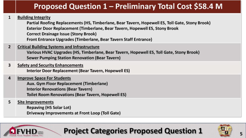 The first question, totaling $58.4 million, would fund critical building system repairs, safety upgrades, and compliance improvements at all six schools. The second, at $25.8 million, would add classroom wings at Bear Tavern and Toll Gate elementary schools to eliminate aging modular units and relieve overcrowding.