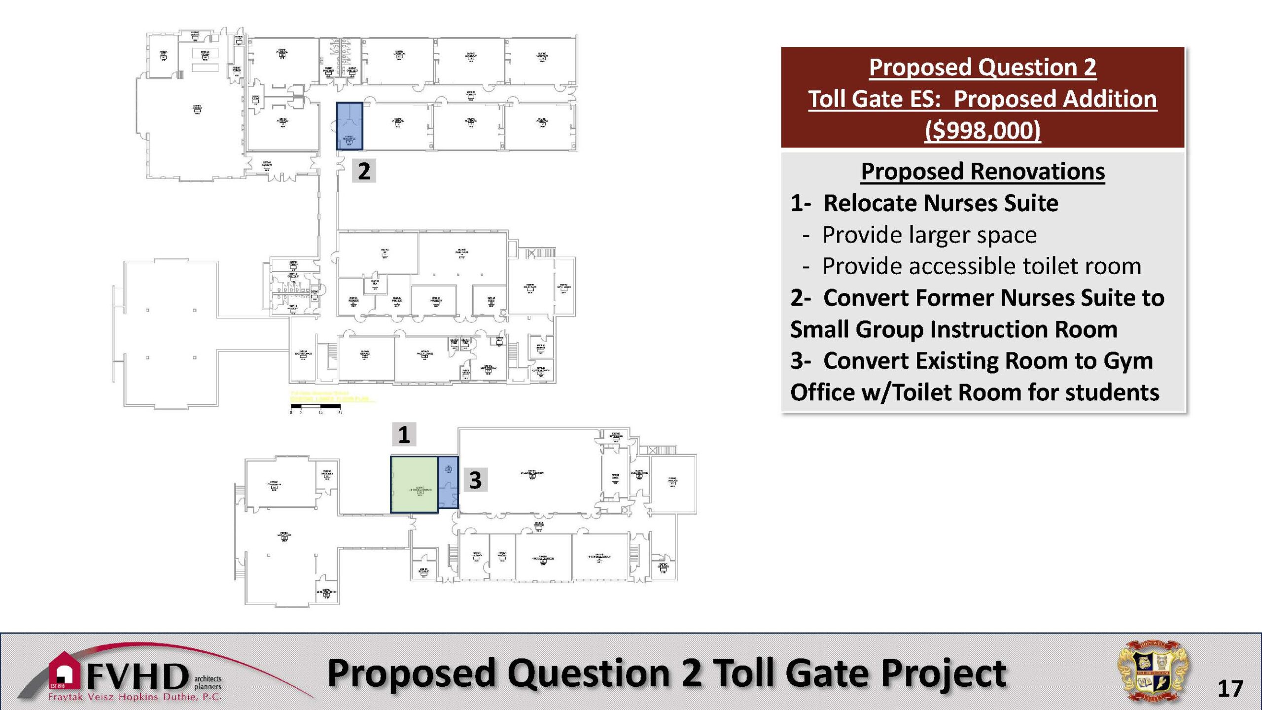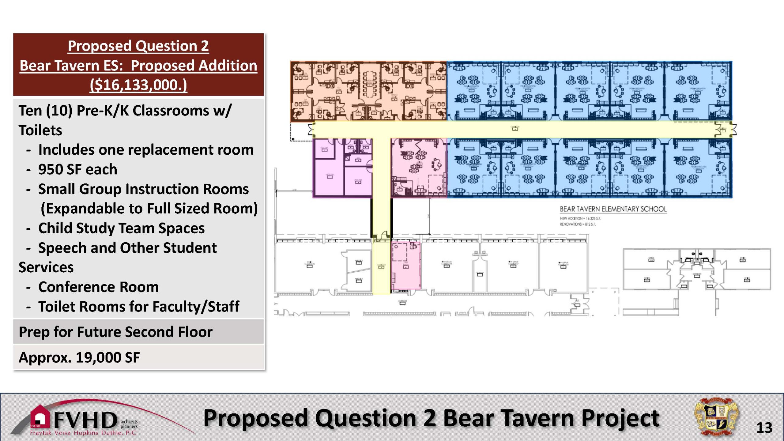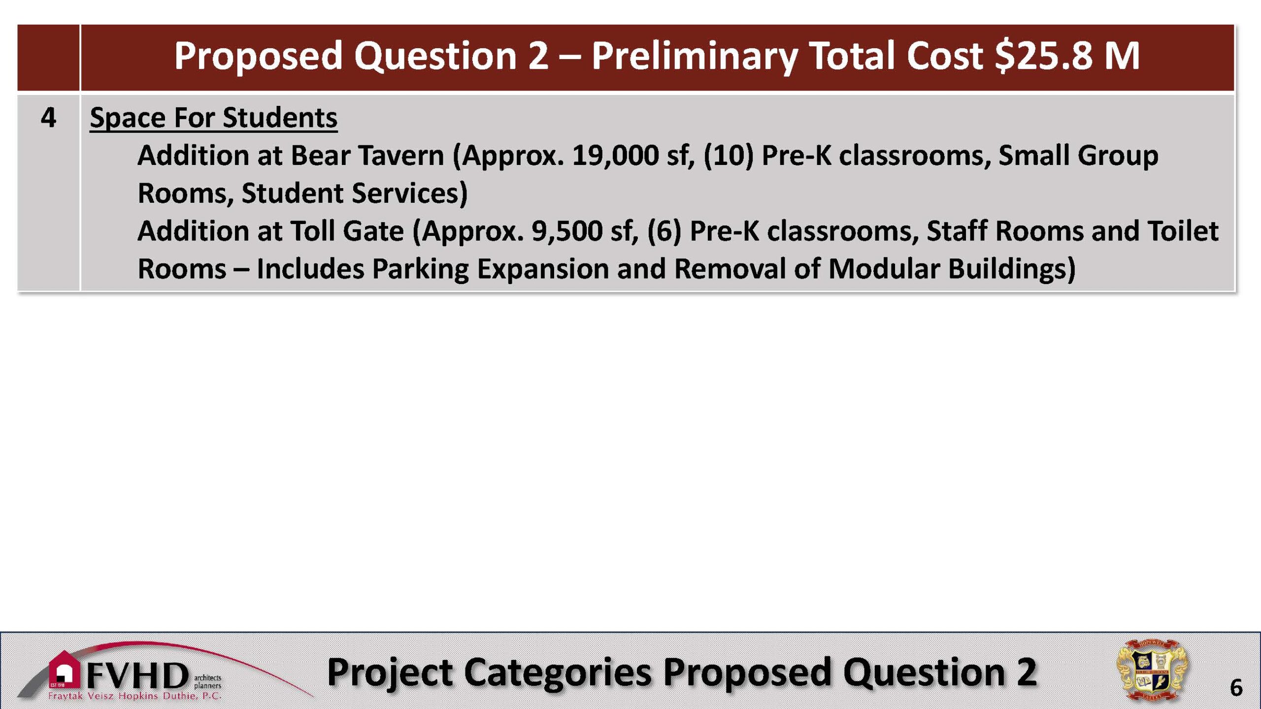 Question 2 proposes $25.8 million for classroom additions at Bear Tavern and Toll Gate to replace modular units and meet increasing demand.