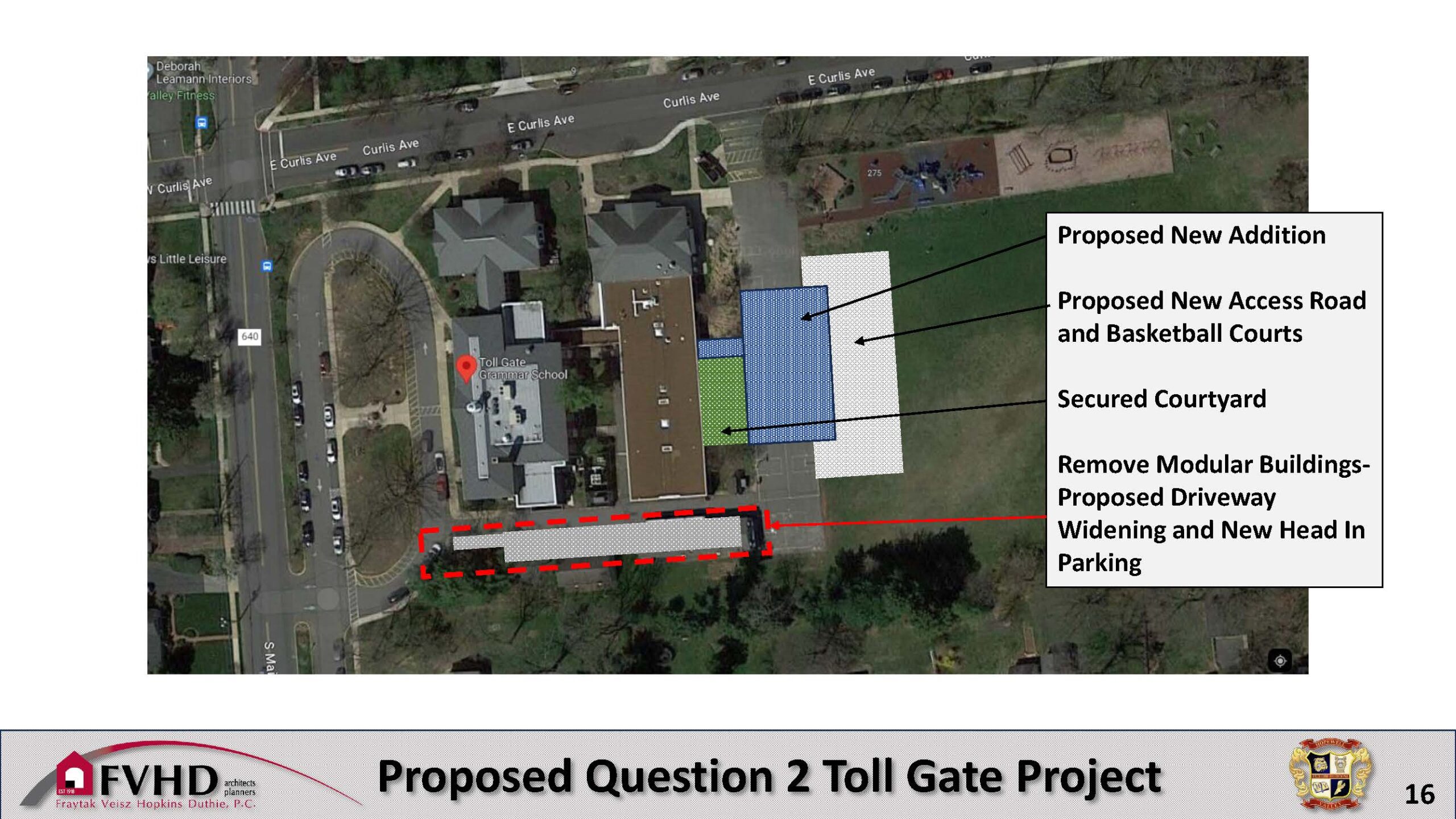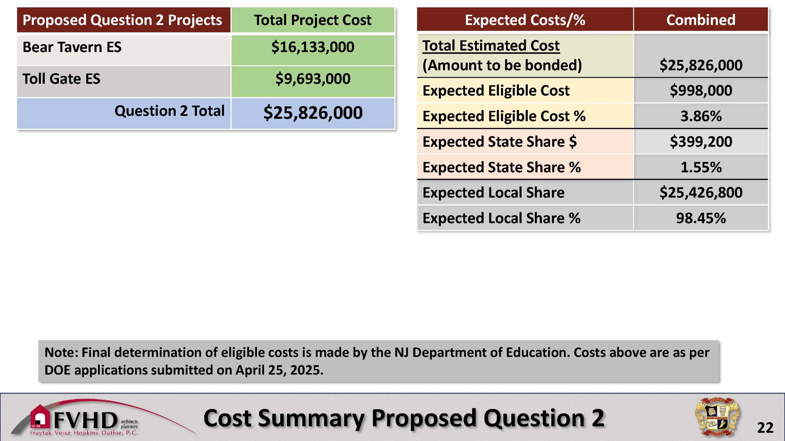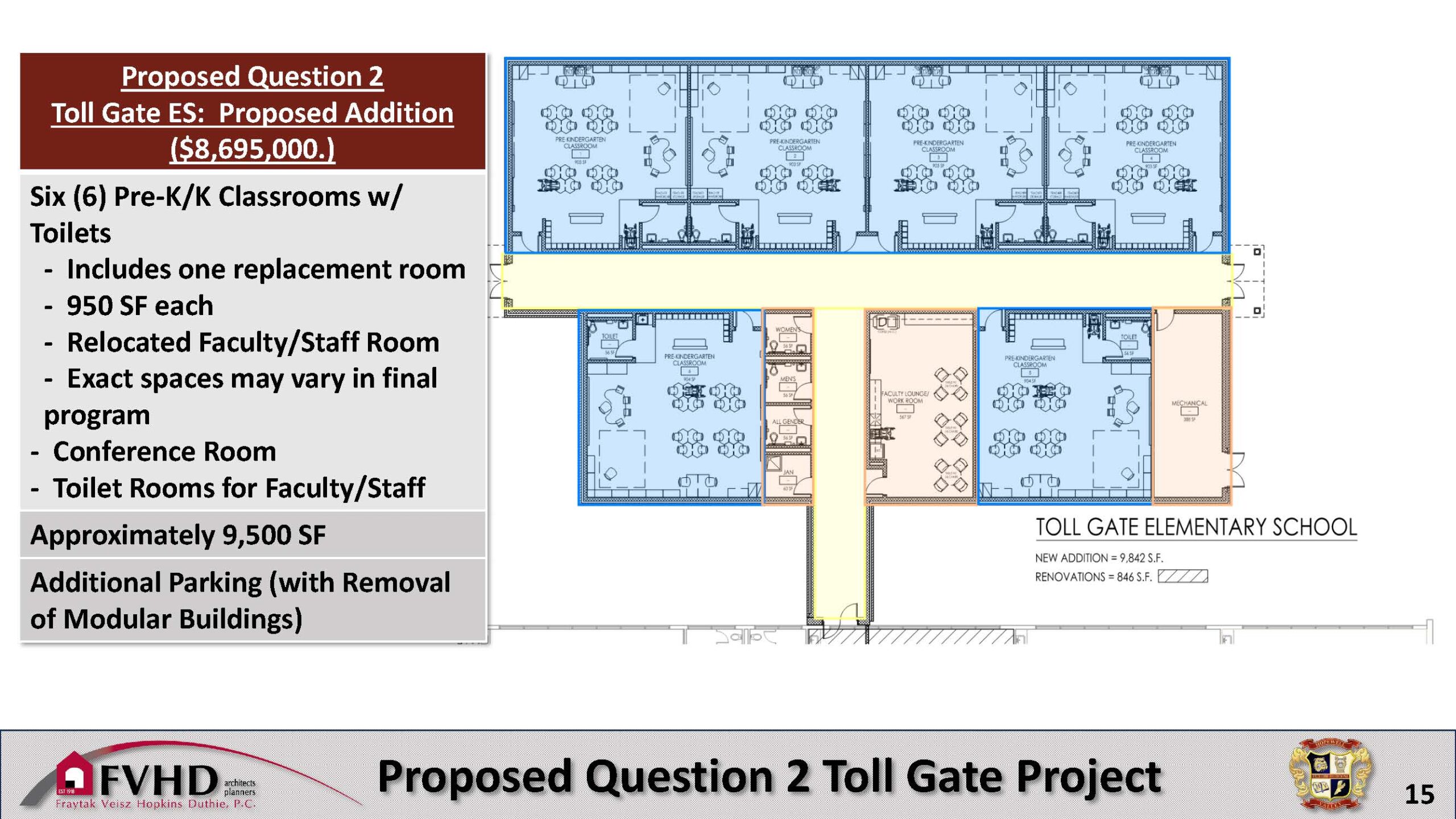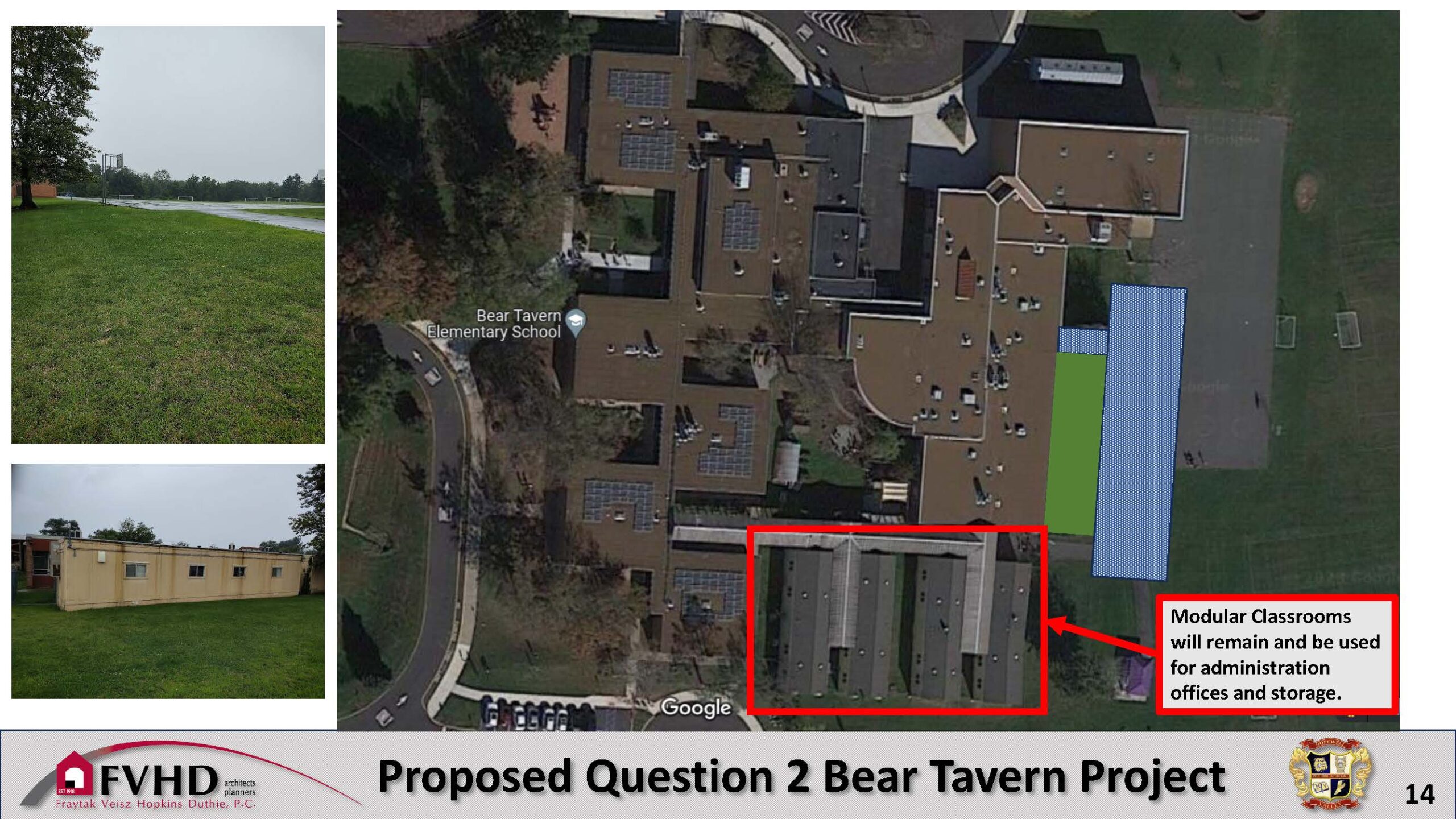 Question 2 proposes $25.8 million for classroom additions at Bear Tavern and Toll Gate to replace modular units and meet increasing demand.
