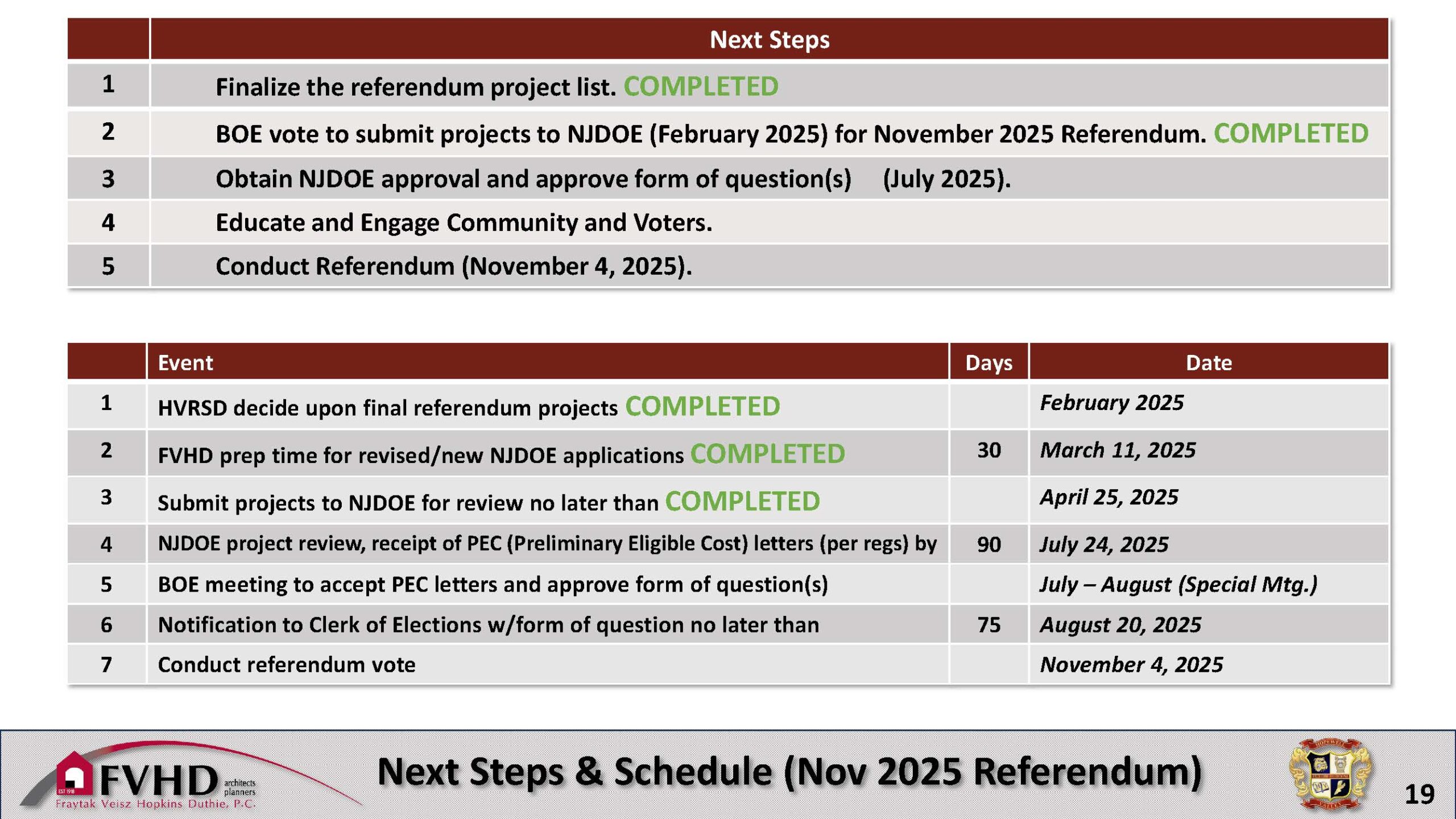 The board is scheduled to vote at the July 21 meeting on the final referendum package and ballot wording. The meeting will be at 6:30pm at the district office.