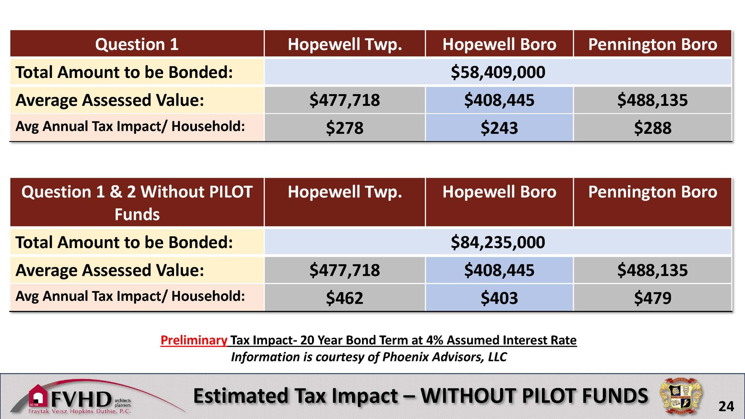 Municipality Q1 Only Q2 Only (No PILOT) Q2 Only (With PILOT) Q1+Q2 (No PILOT) Q1+Q2 (With PILOT) Hopewell Township $290.85 $171.12 $53.73 $461.97 $344.58 Hopewell Borough $250.02 $152.76 $51.82 $402.78 $301.84 Pennington Borough $285.58 $193.33 $71.56 $478.91 $357.14
