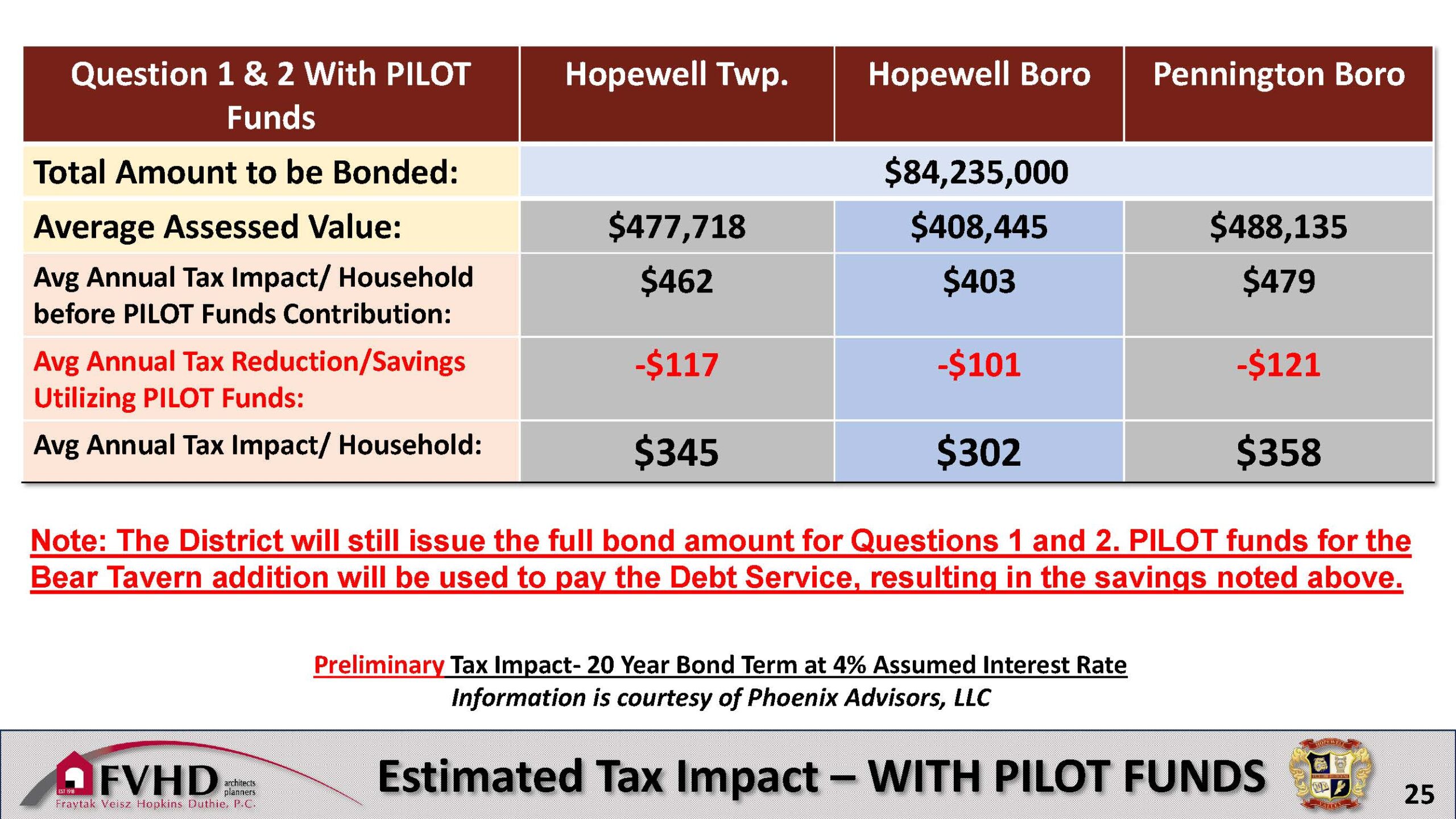 Hopewell Township has committed $16.1 million in PILOT (Payment in Lieu of Taxes) revenue to help fund the Bear Tavern classroom addition. The money would come from new development projects which generate PILOT payments instead of traditional property taxes. However, the availability of those funds is contingent on the resolution of ongoing litigation with Pennington Borough, which has challenged how the township allocates PILOT dollars. Hopewell Borough was also party to the suit but has since exited the litigation.