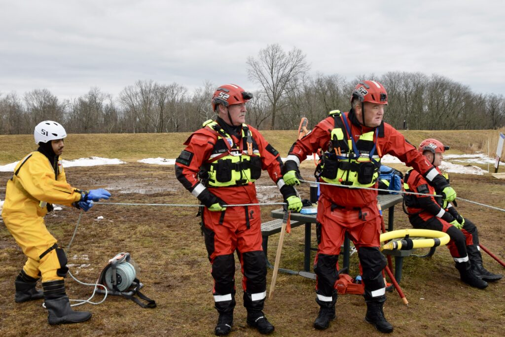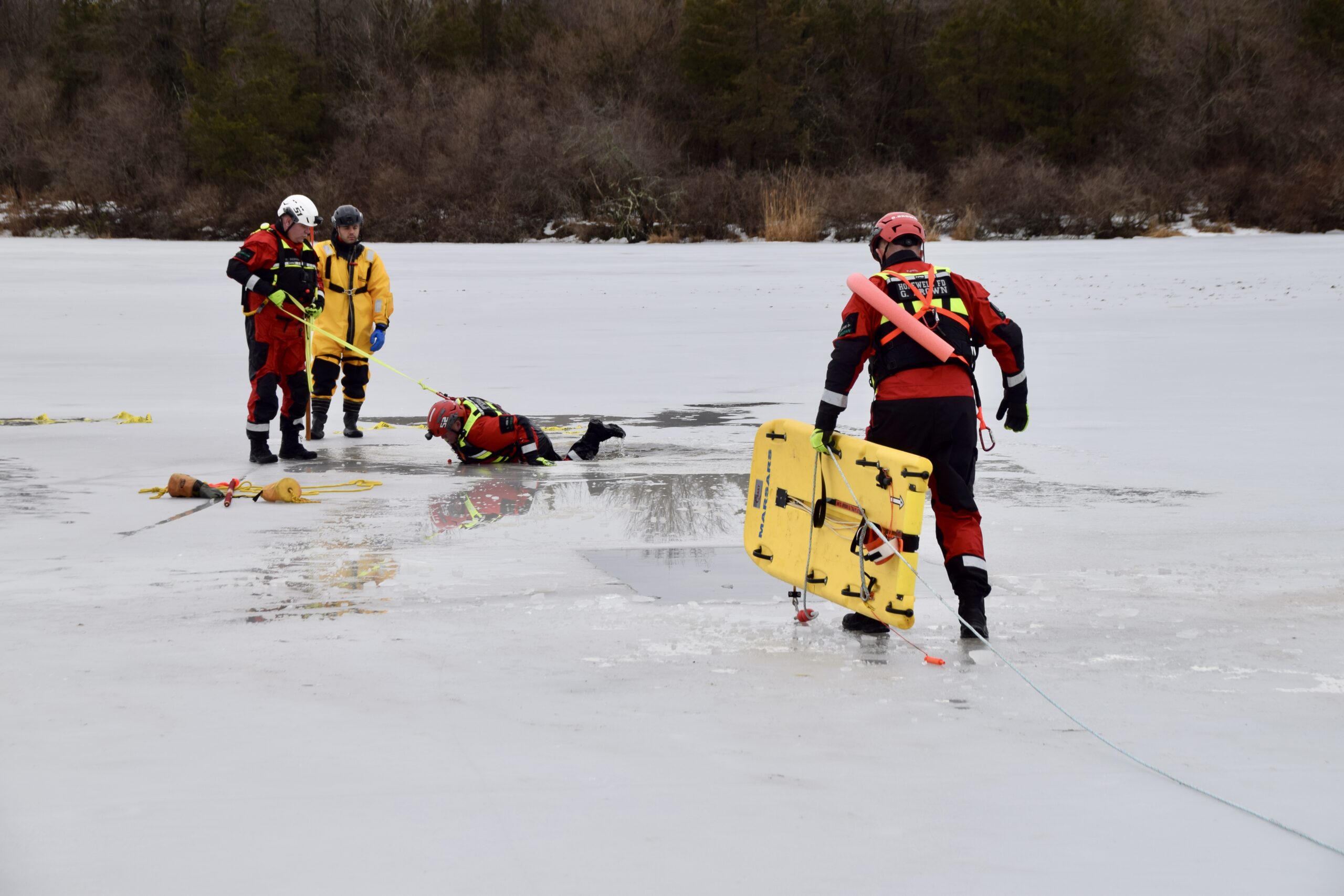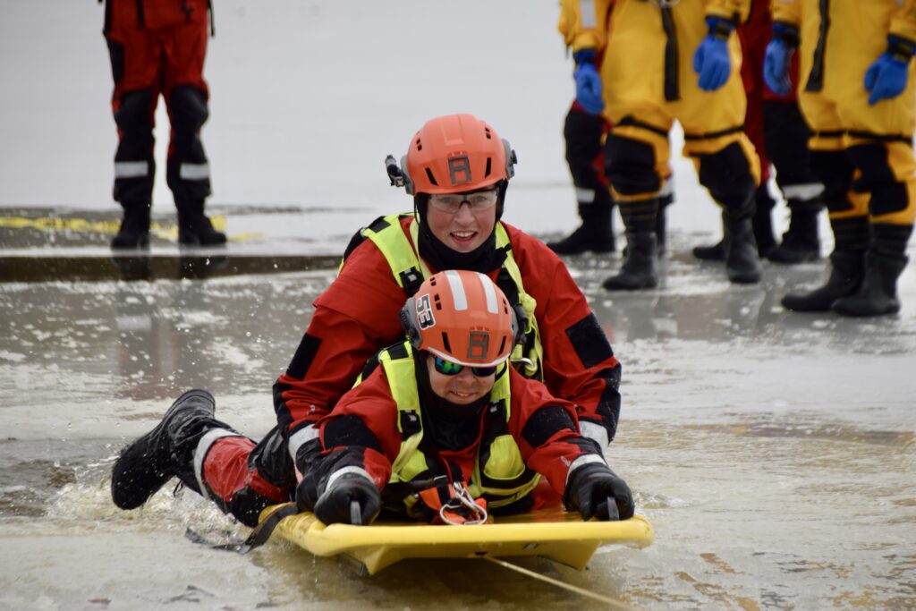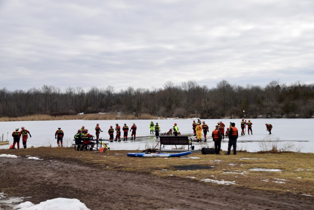 The training places responders in full cold-water protective gear and simulates real-world scenarios in which victims have fallen through ice. Teams practice self-rescue, victim stabilization, tethered entry, and coordinated extraction techniques — all while operating on unstable surfaces where rescuers themselves can be at risk.