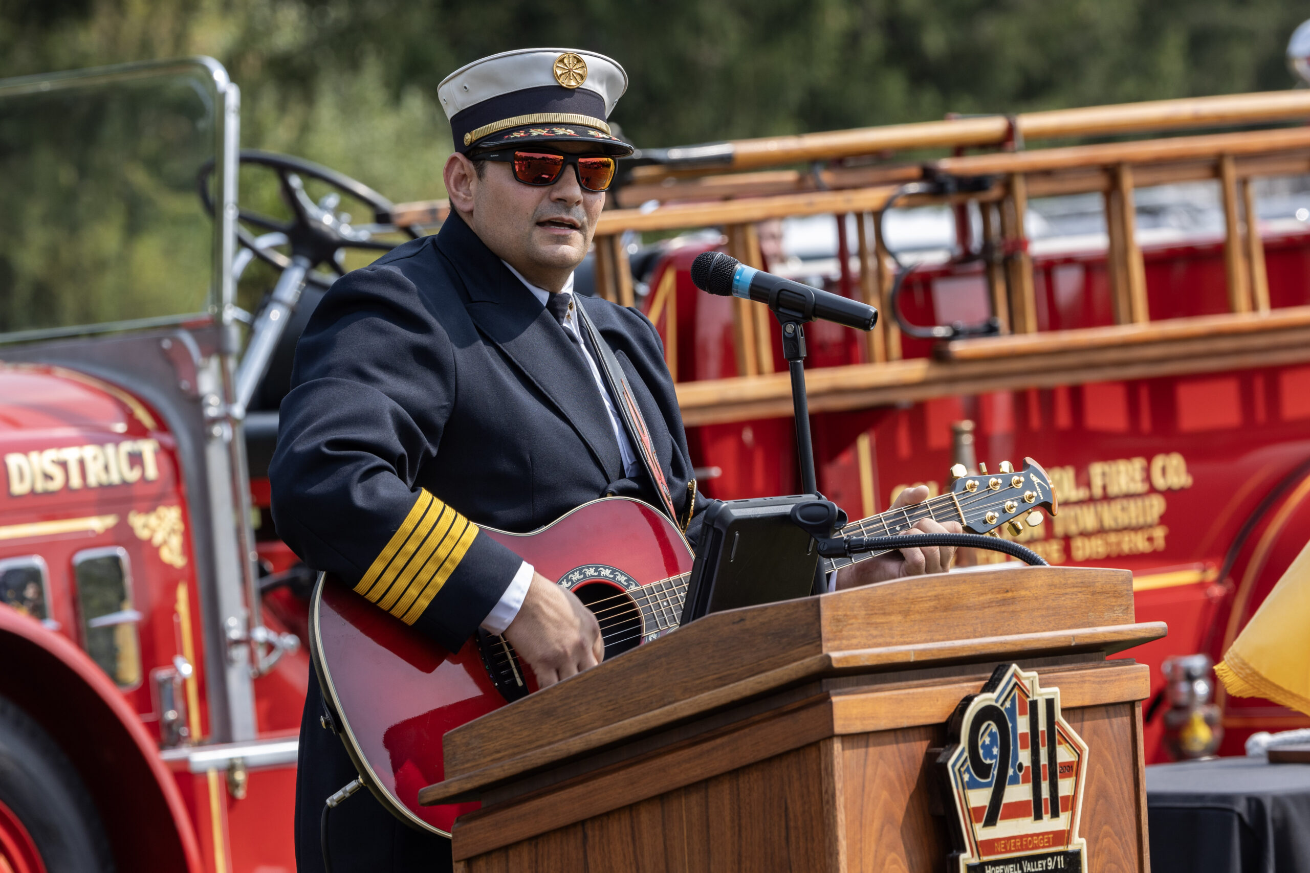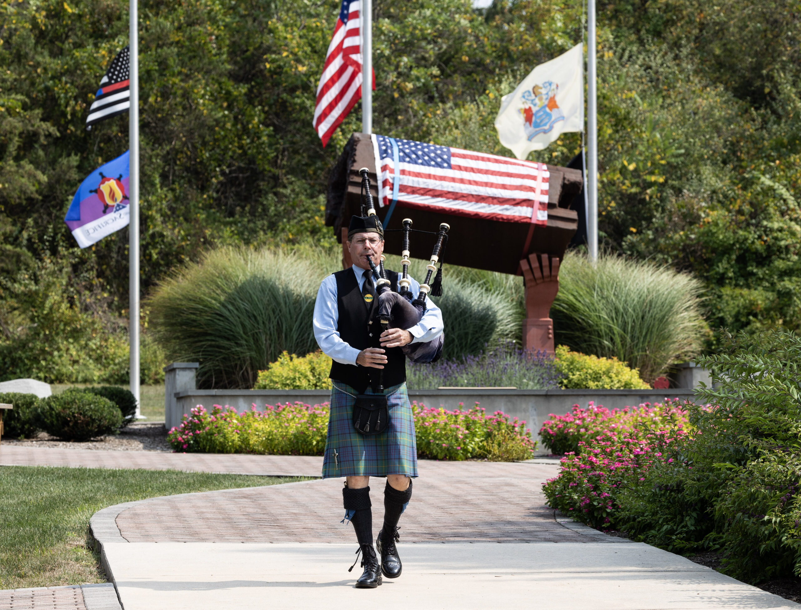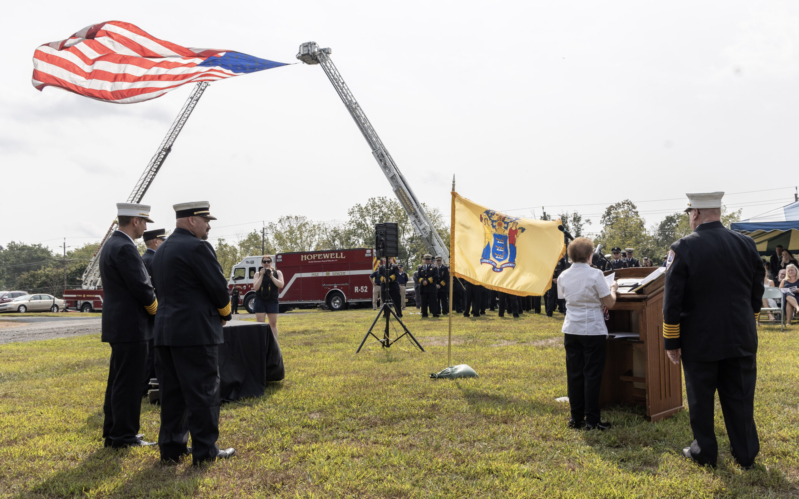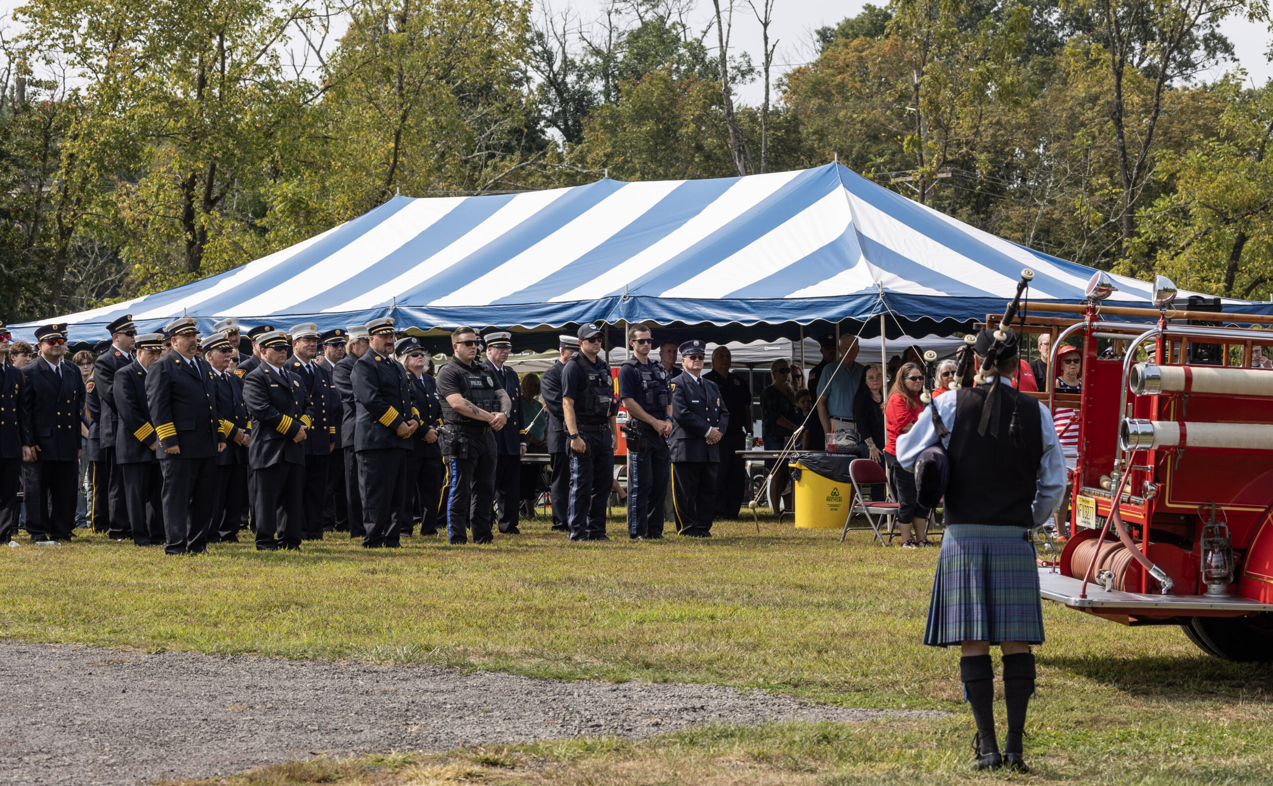 Bagpiper Doug Conners opened the ceremony before the Joint Hopewell Valley Color Guard presented the colors. Hopewell Chief Joseph Novak led the national anthem, followed by an invocation from Deacon Michael Riley from the Pennington Fire Company.