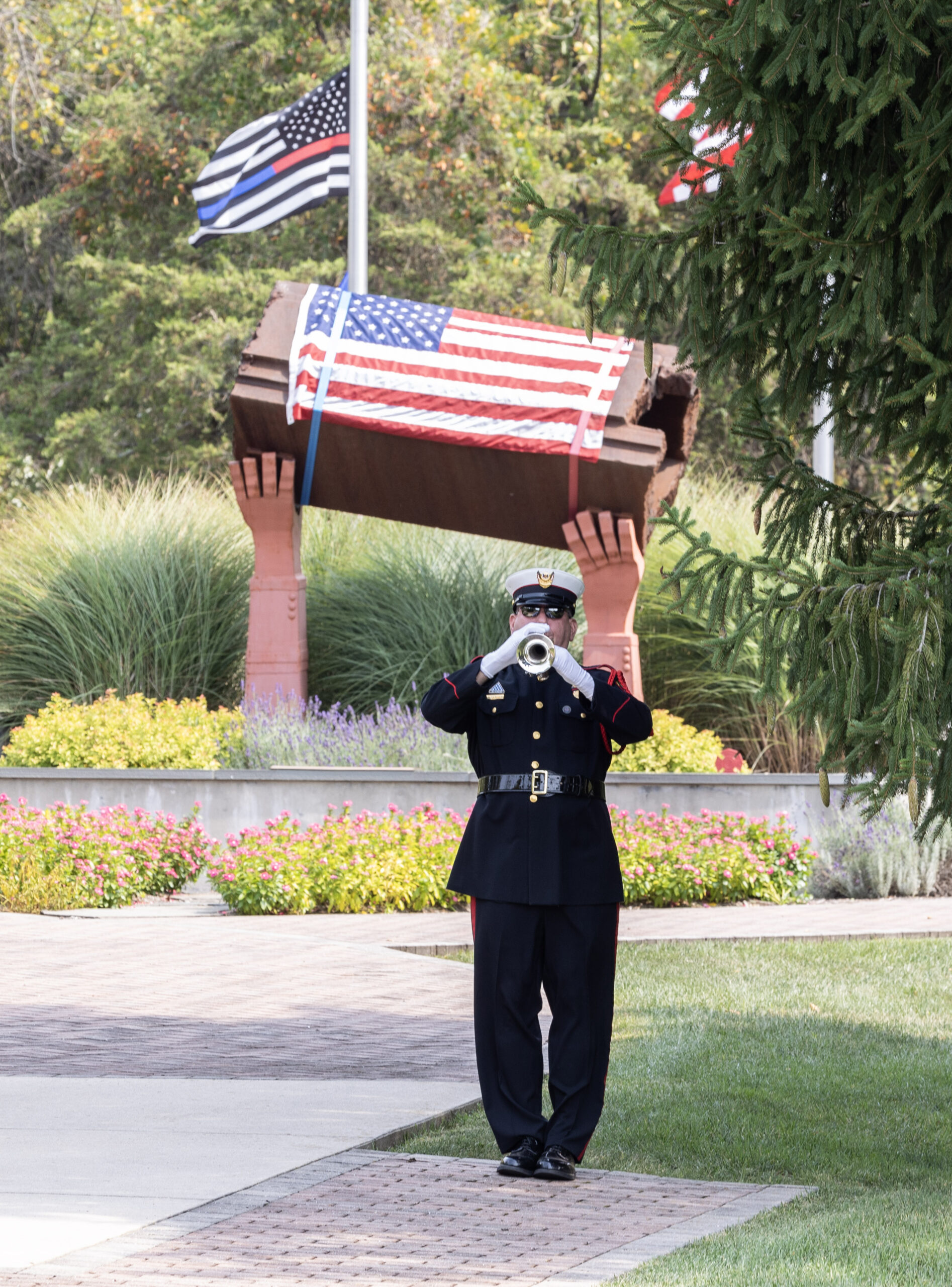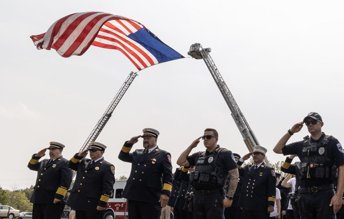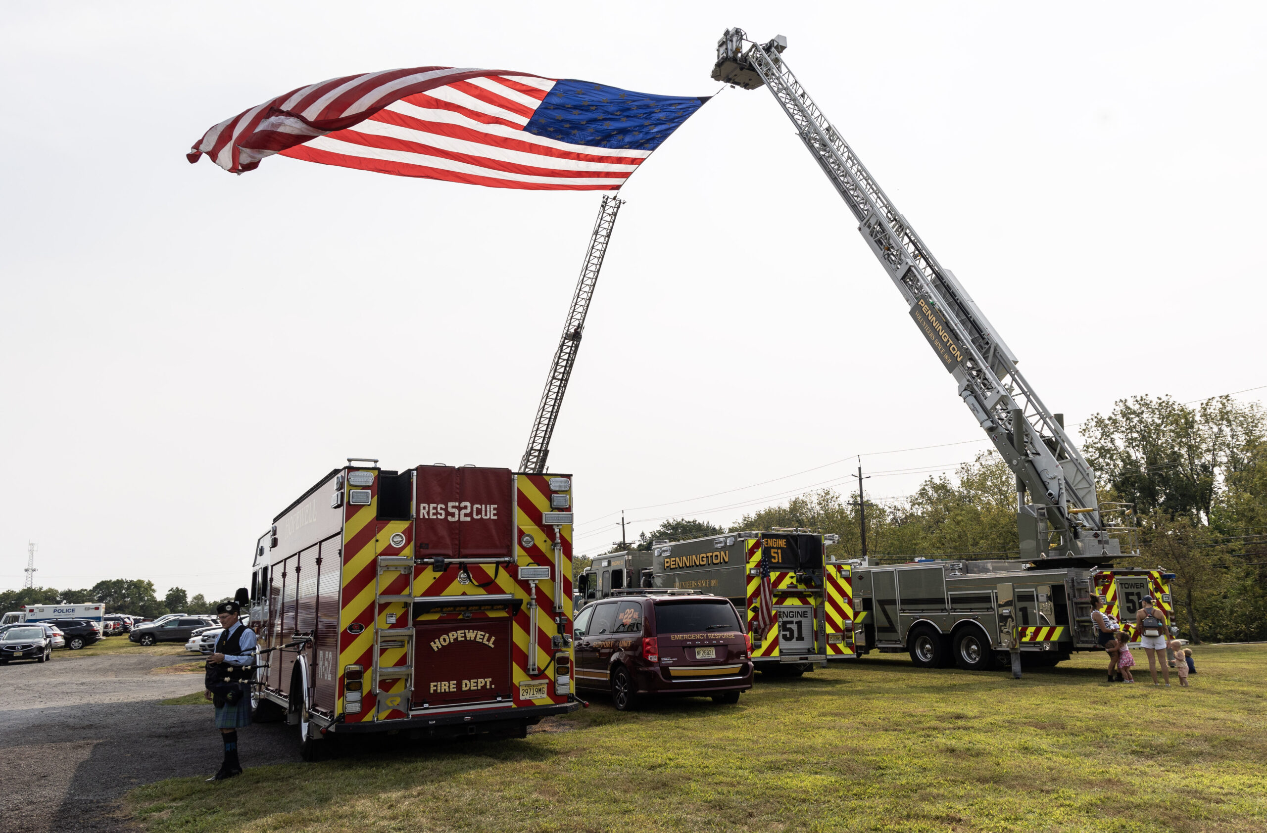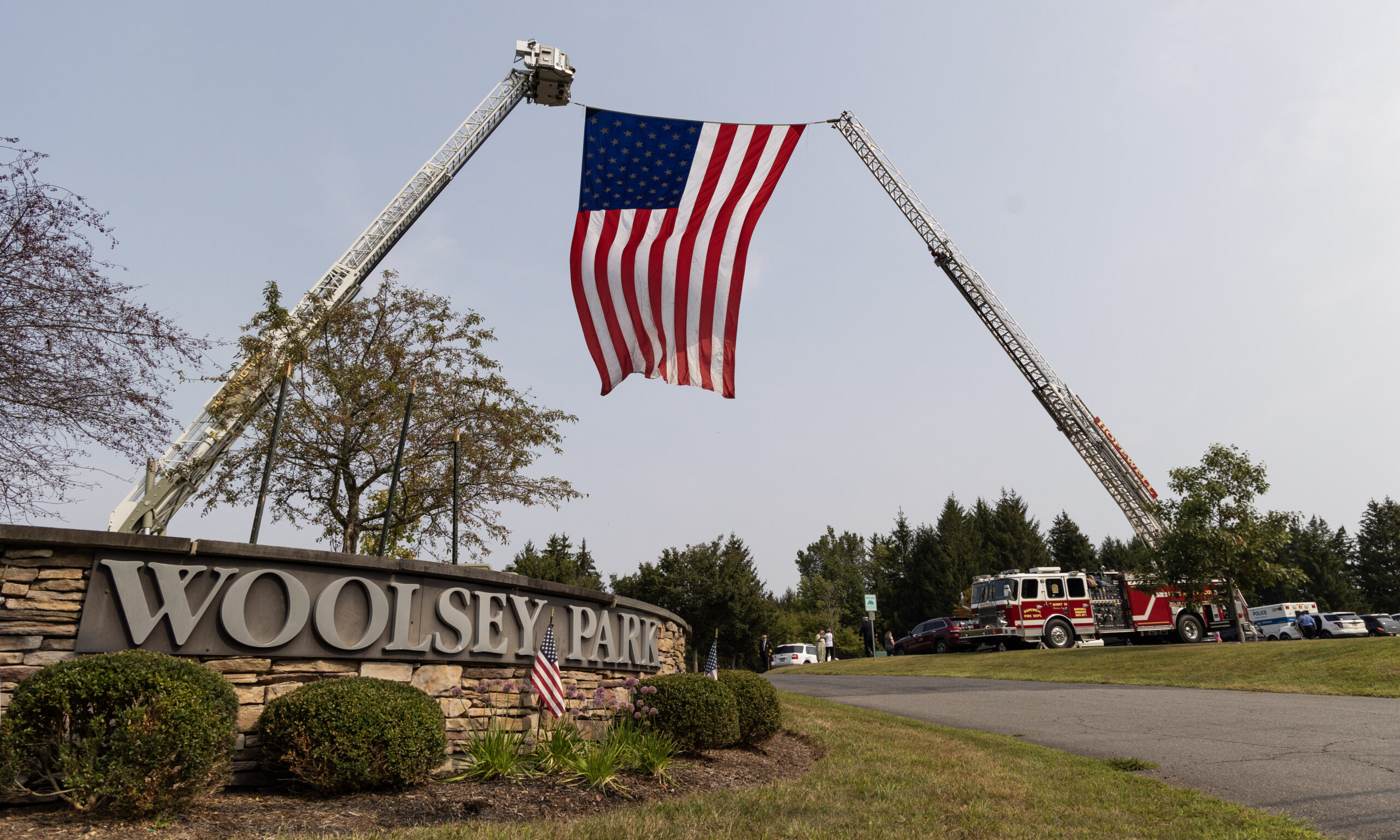 Two ladder trucks hoisted a giant American flag above the park’s entrance as guests filed in, setting a solemn tone for the service held before the township’s memorial that incorporates a large steel beam from the World Trade Center. This year marks the 24th anniversary of the attacks, and the 15th time the community has gathered at the site since the memorial’s dedication.