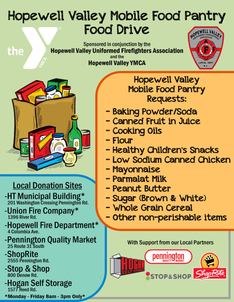 The Hopewell Valley Uniformed Firefighters Association and the Hopewell Valley YMCA are sponsoring a community food drive to support the Hopewell Valley Mobile Food Pantry.
