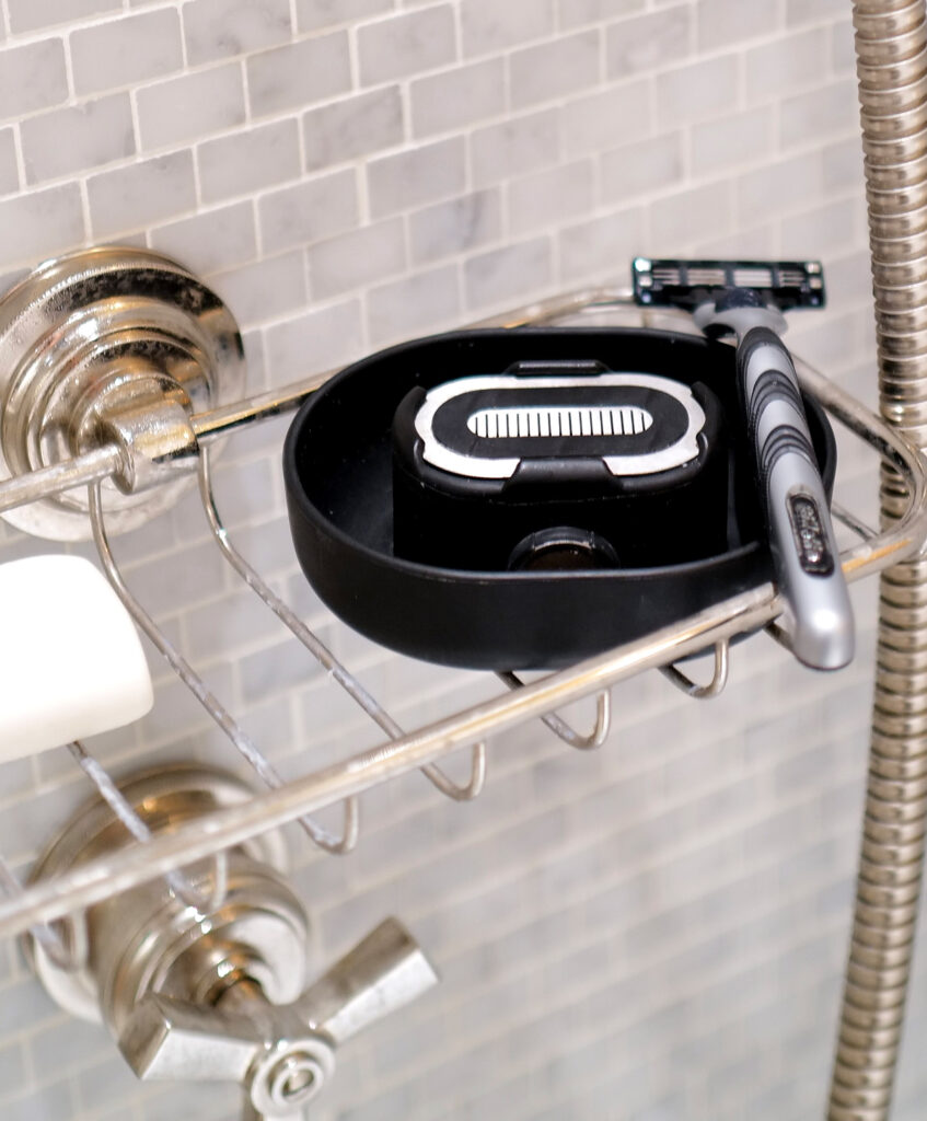 The Razor Rinser works a bit like a bar glass rinser—press down, and a burst of water shoots through your razor blades to rinse out hair and shaving cream. It only takes a few ounces of water and can be reused for an entire shave. The whole thing disassembles easily and can be cleaned or dumped out between uses.