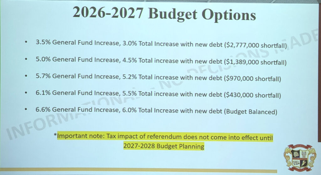 Even with an increase approaching 5.7%, administrators said the district would still need to make targeted cuts to balance the budget. Lower increases would deepen the shortfall, while higher increases could reduce the need for reductions but raise concerns about affordability. With a 5.7% increase the district is still expecting about a $1 million shortfall.