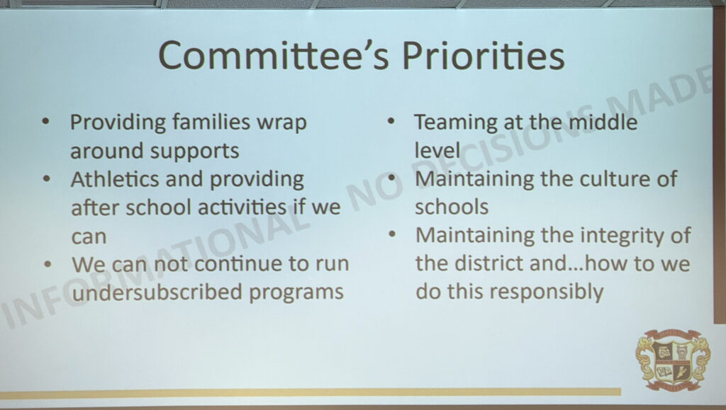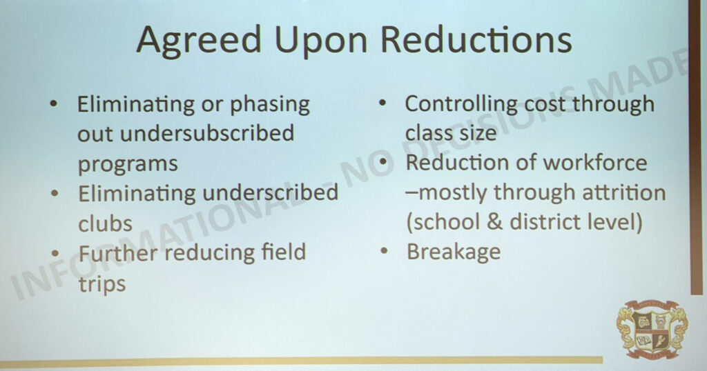 Options discussed included adjustments to departmental budgets, curriculum and instruction allocations, assemblies and guest speakers, subscriptions and supplies, and other non-mandated expenses.