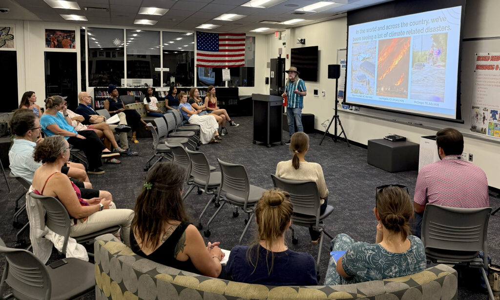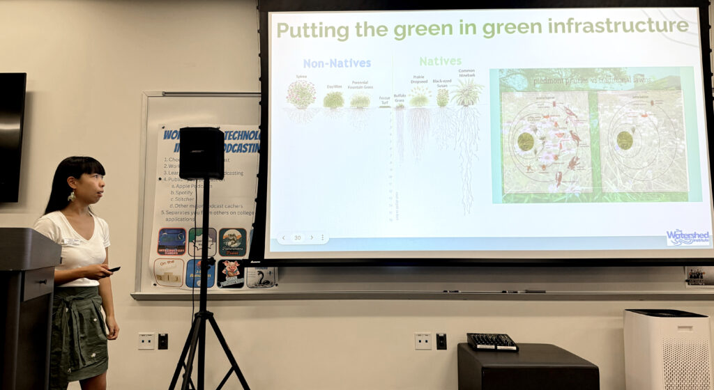 Olivia Spildooren, River-Friendly Coordinator at The Watershed Institute, explained how native plant species have much deeper root systems and help absorb stormwater, prevent erosion, and support biodiversity. She shared ideas and information about how green infrastructure including rain barrels, bioswales, pervious paving, and downspout planters can help slow down water and prevent flooding.