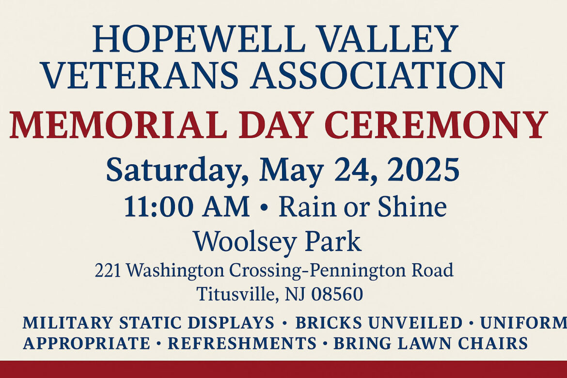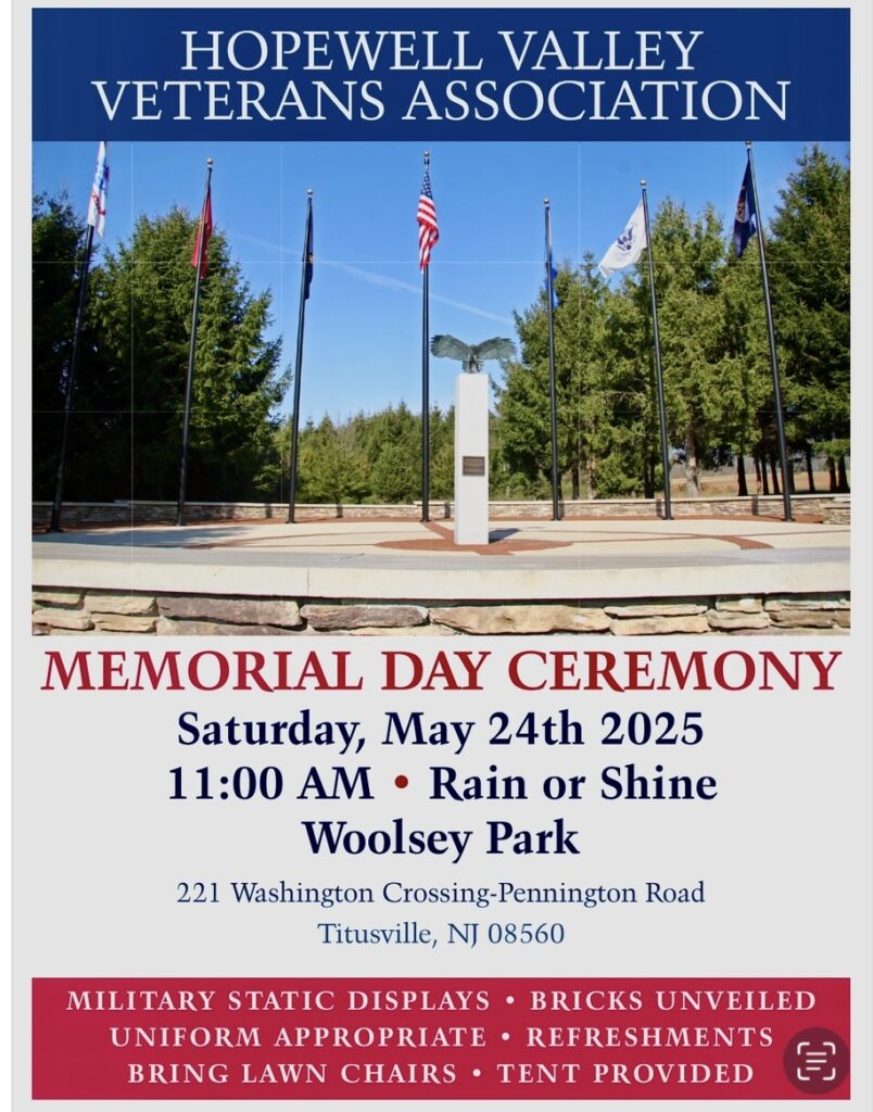 The Hopewell Valley Veterans Association will hold its annual Memorial Day Ceremony on Saturday, May 24, 2025, at 11:00 AM at Woolsey Park (221 Washington Crossing-Pennington Road, Titusville, NJ 08560). The event will take place rain or shine.
