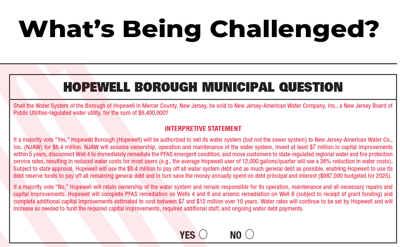 A Hopewell Borough resident has filed a lawsuit in Mercer County Superior Court challenging the ballot language used in the Nov. 4 referendum on whether to sell the Borough’s municipal water system to New Jersey American Water, arguing that voters are not being provided neutral or adequate information before casting their ballots.