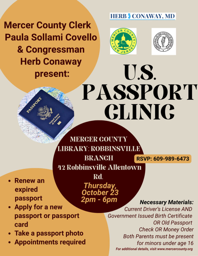 Mercer County Clerk Paula Sollami Covello and Congressman Herb Conaway will host a Passport Outreach Event on Thursday, October 23, 2025, from 2:00 to 6:30 p.m. at the Mercer County Library, Robbinsville Branch. Mercer County residents can apply for a new passport, renew an expired one, take a passport photo, or obtain a passport card—all in one location.