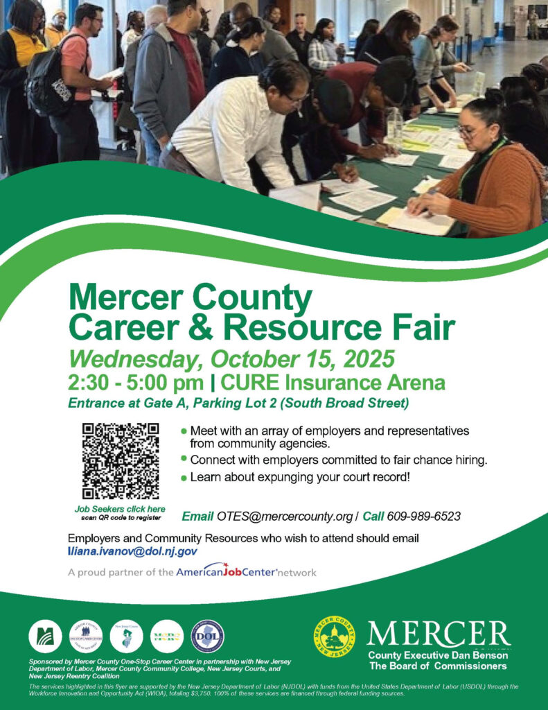 The event is hosted by Mercer County One-Stop Career Center in partnership with the New Jersey Department of Labor, Mercer County Community College, New Jersey Courts, and the New Jersey Reentry Coalition.