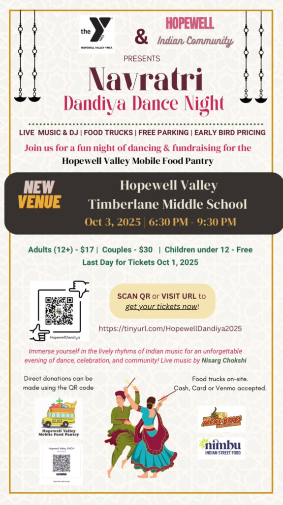 The Hopewell Valley YMCA and the Hopewell Indian Community are teaming up once again to host Navratri Dandiya Dance Night, a lively evening of music, dance, food, and fundraising for the Hopewell Valley Mobile Food Pantry.