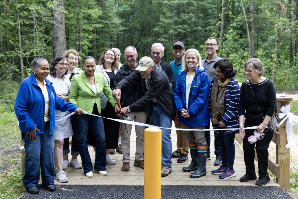 Trail advocates, public officials, and community members gathered Saturday morning to cut the ribbon on a new segment of the Lawrence Hopewell Trail (LHT): a raised boardwalk weaving through the wetlands of Maidenhead Meadows and offering a safer, more scenic route for walkers and cyclists.